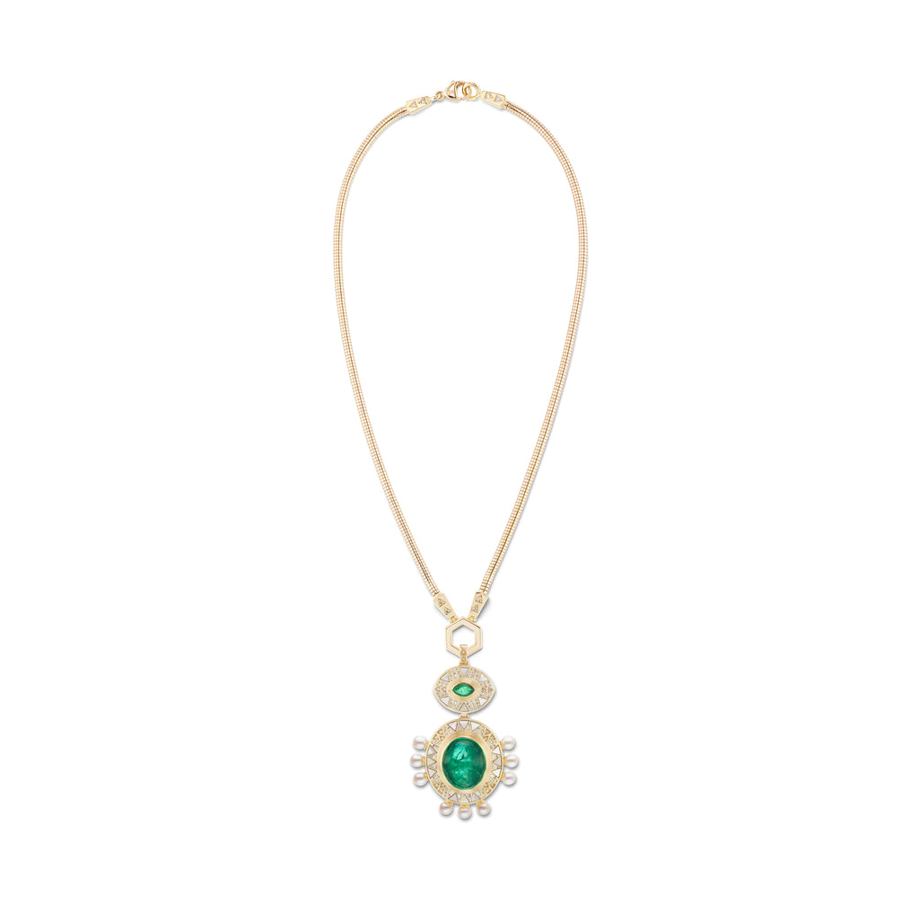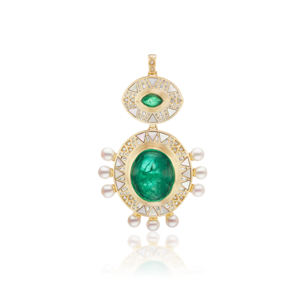 18k Yellow Gold, Muzo Marquise 1.41 ct and Oval 23.12 ct Emerald Center Stones, Mother of Pearl Inlay, White Diamonds 1.17 ct and White Cultured Pearls Chain: 16", 3.2mm 18k Yellow Gold Boa Foundation Chain