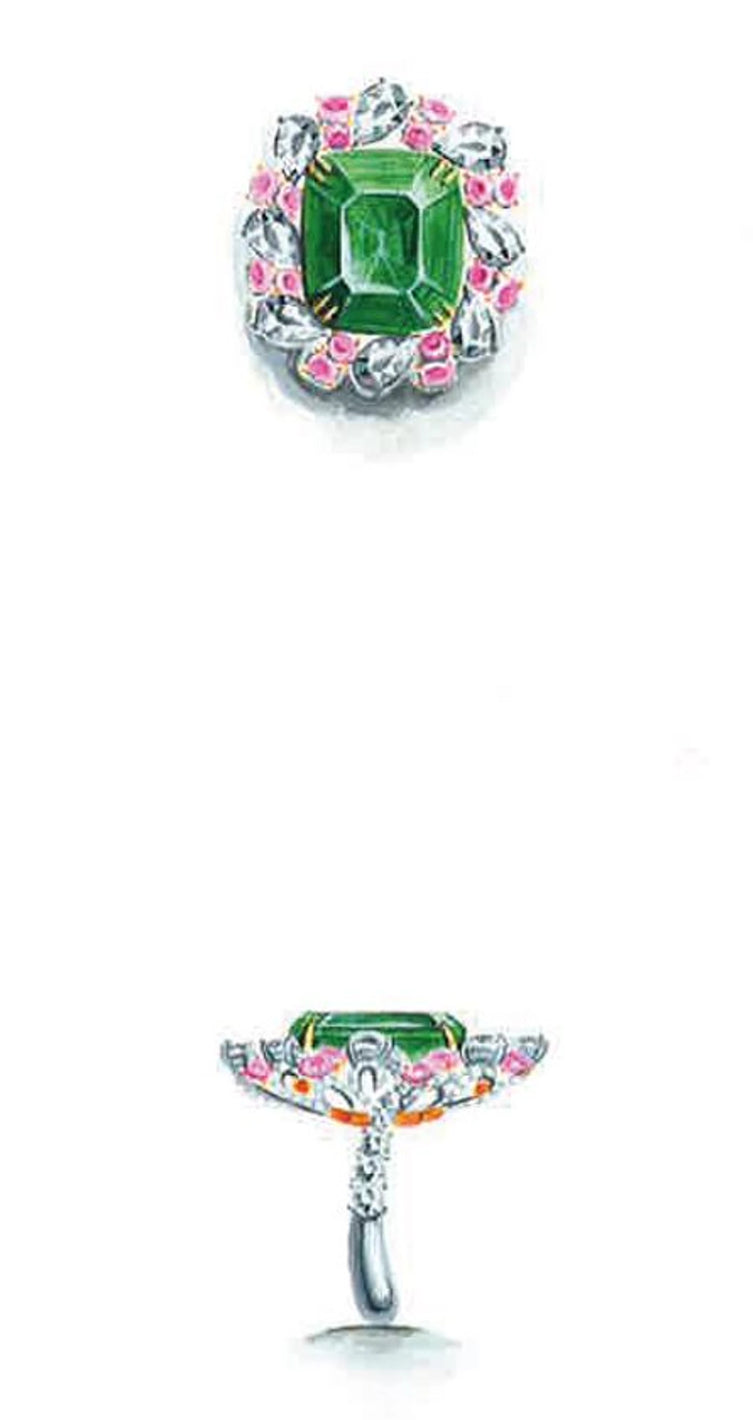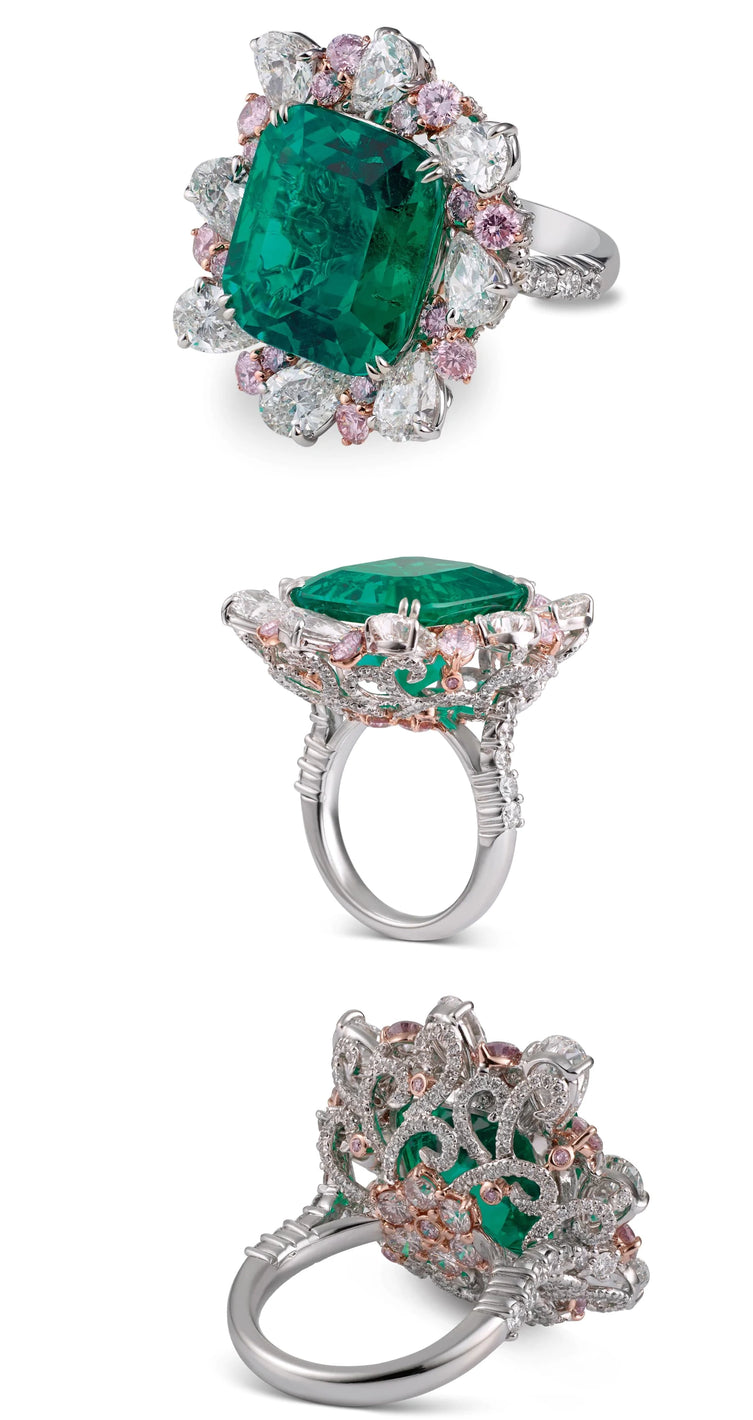 This ring showcases a beautiful deep green emerald weighing 16.39 carat elegantly set in platinum and 18K gold with Argyle pink diamonds and white fancy shaped diamonds.