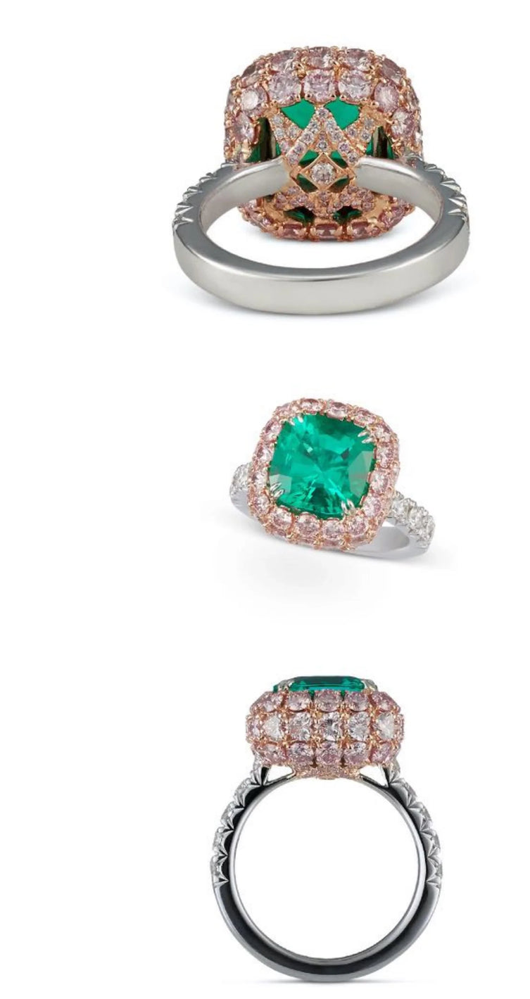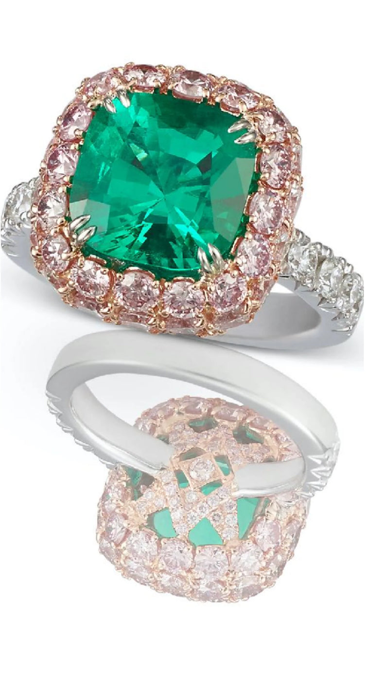 Inspired from our original Green Jewel ring, this exquisite piece personifies elegance and romance. A Muzo emerald weighing 3.27 carat encased in a blanket of Argyle pink diamonds, this ring accentuates the raw beauty of these precious materials.