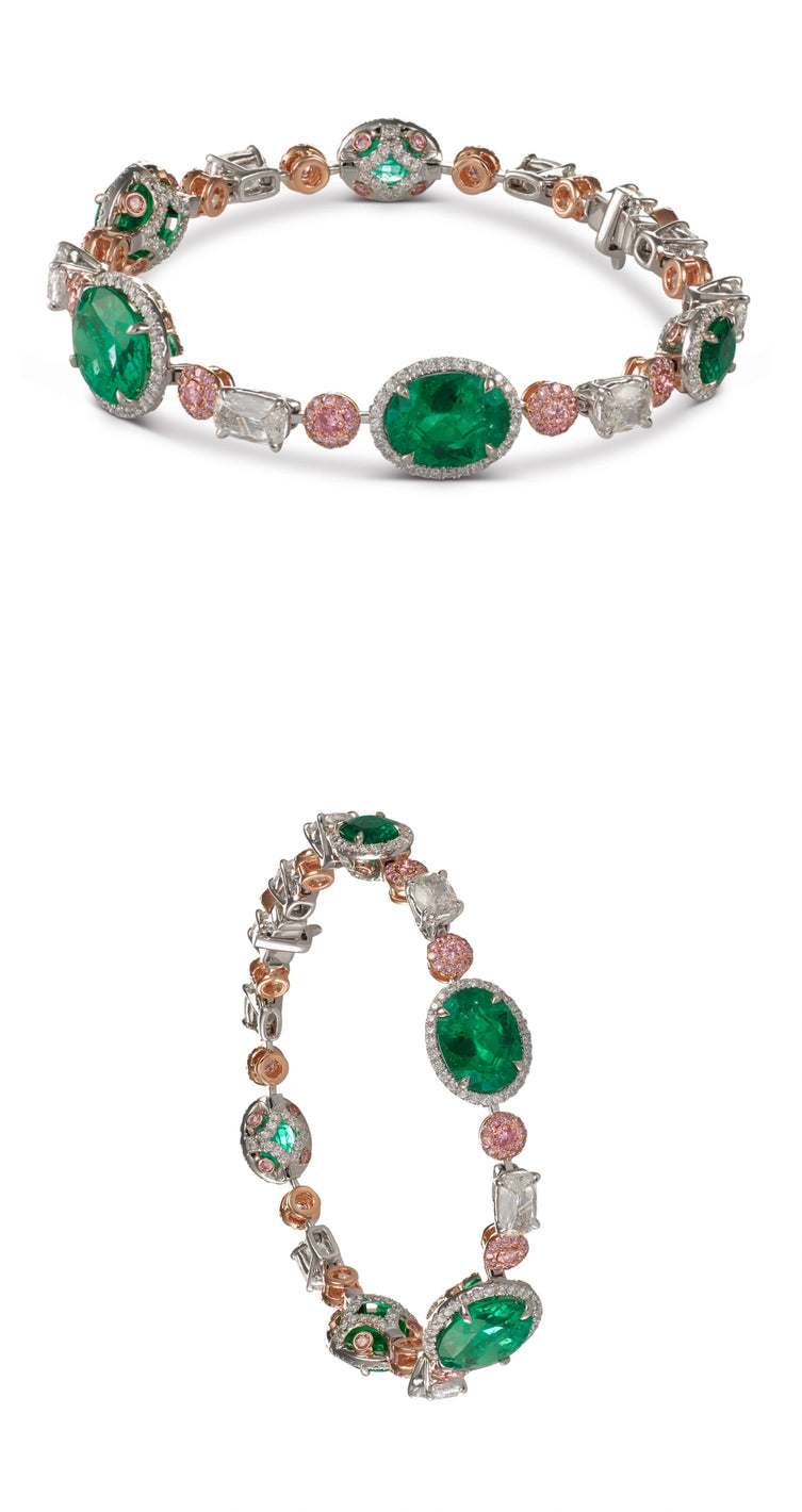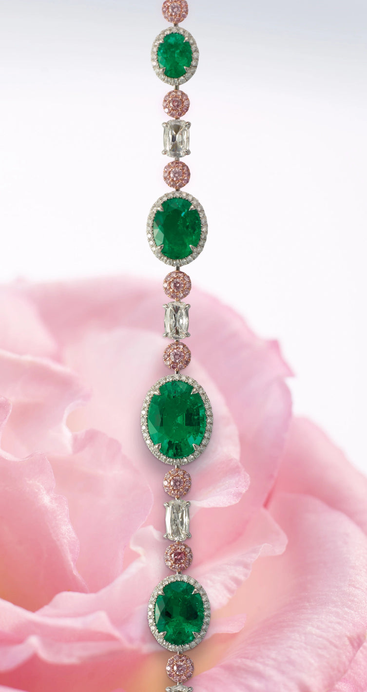 Stunning oval Muzo emerald bracelet interspersed with alternating Argyle pink and white diamonds. Delicate design features nearly 9 carat of the finest Muzo emeralds.