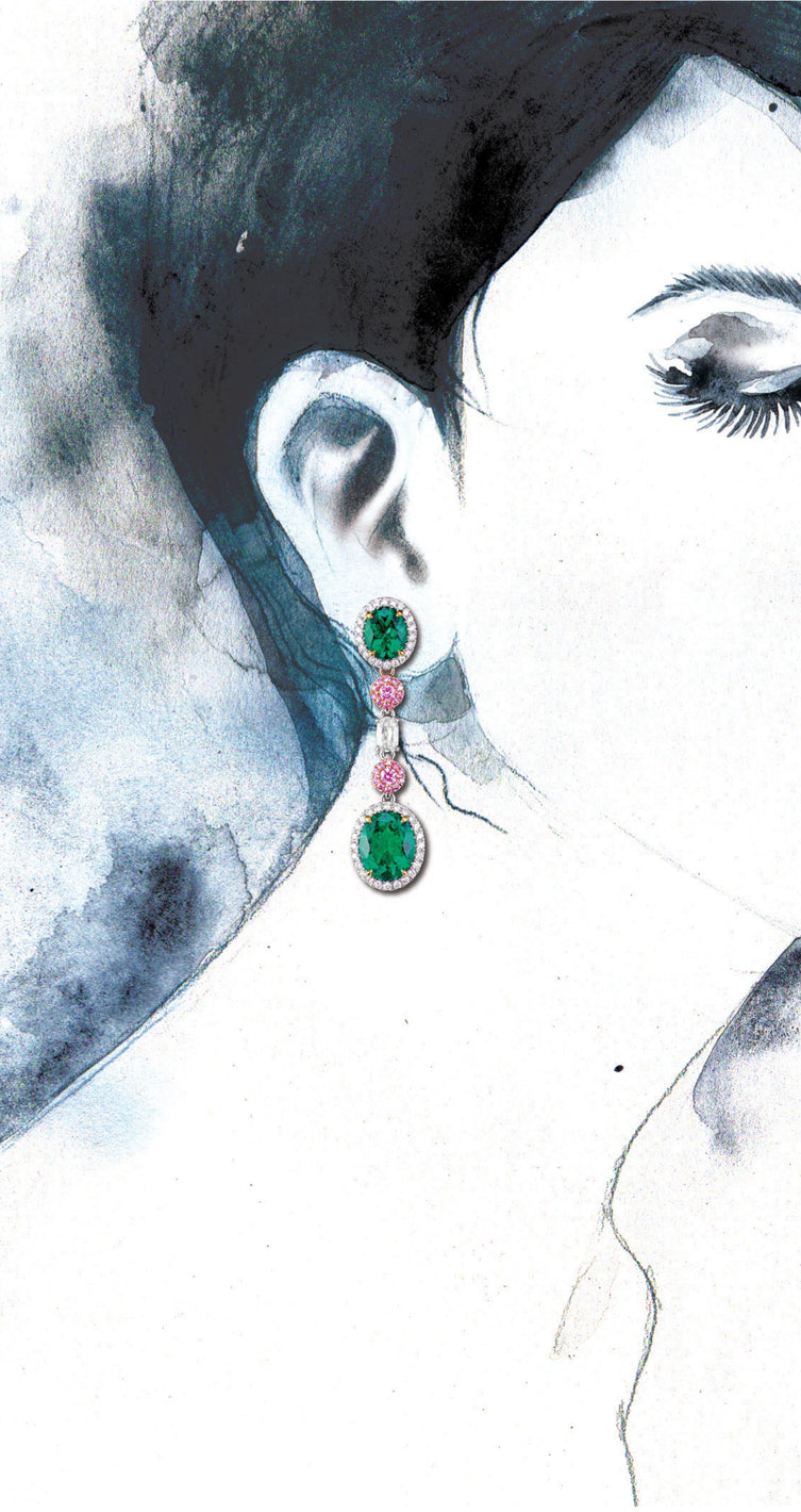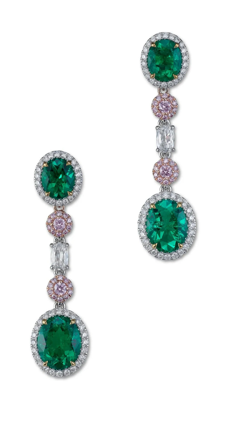 Splendid Oval brilliant-cut emeralds weighing total 8.83 carats, separated by cushion-shaped white diamonds 0.64 carats, surrounded with Argyle pink and white diamonds set in platinum and 18K gold.