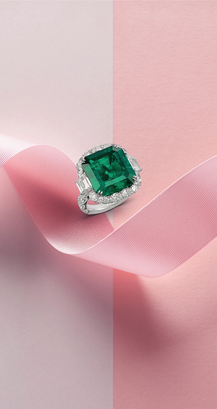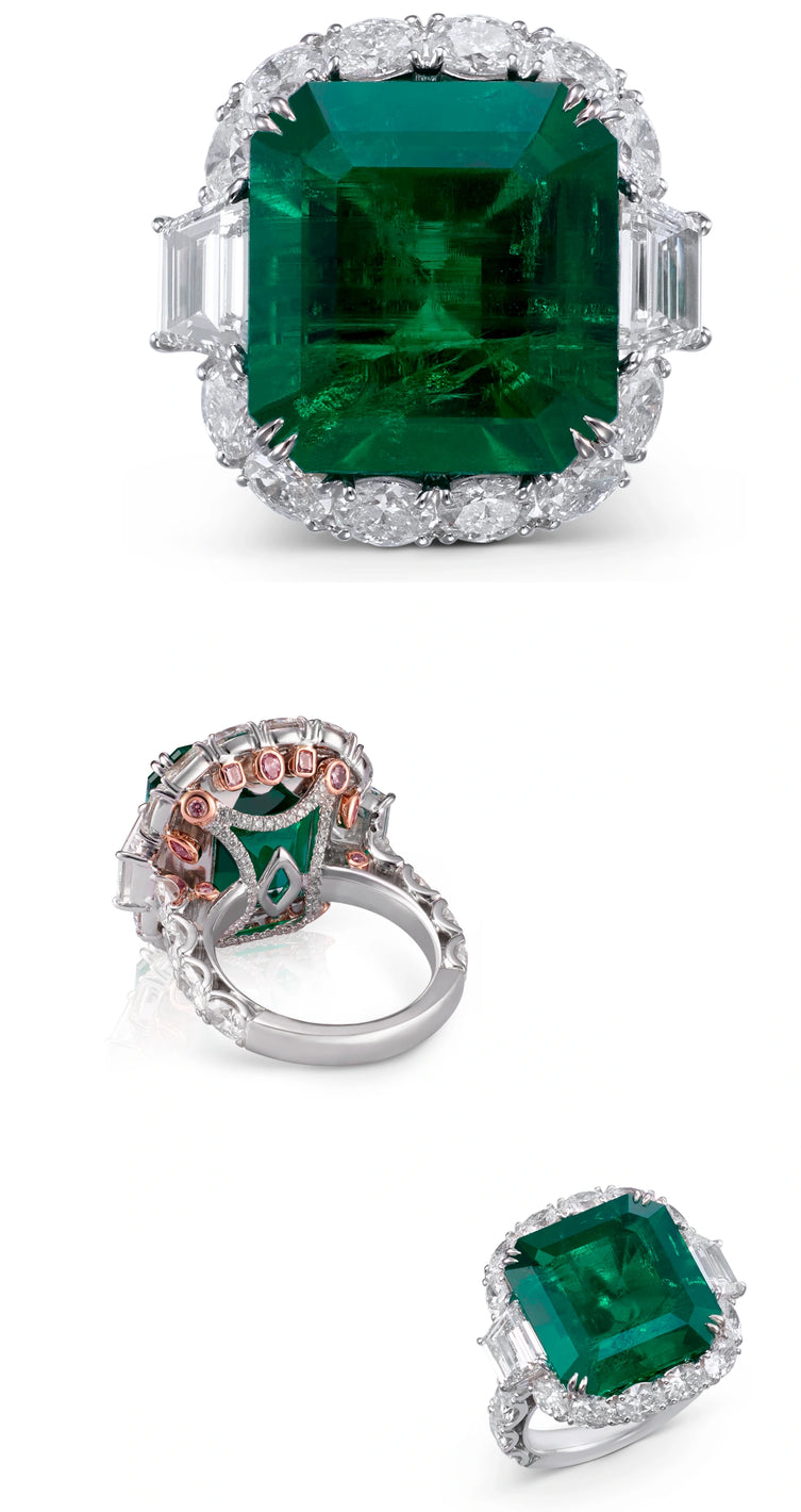 Impeccably balanced ring set with 15.03 carat emerald surrounded with 4.93 carat white diamonds and strategically placed pink diamonds weighing 0.26 carat.