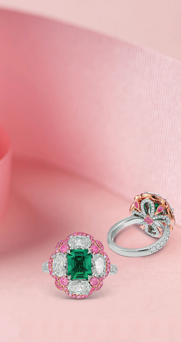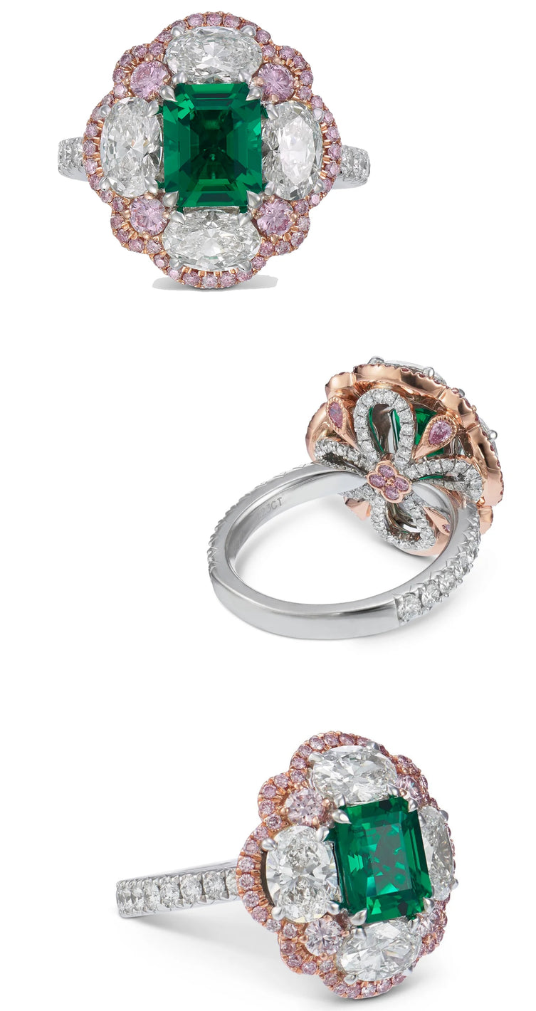 No-oil emerald, a rarity in the gem world, of 1.23 carat is set in this flower like ring, with white oval brilliant-cut diamonds totaling 2.08 carat. To add a magical touch to the gem, our master jeweler has added some pink diamonds to lift the deep green of the Muzo emerald featured as the center piece.