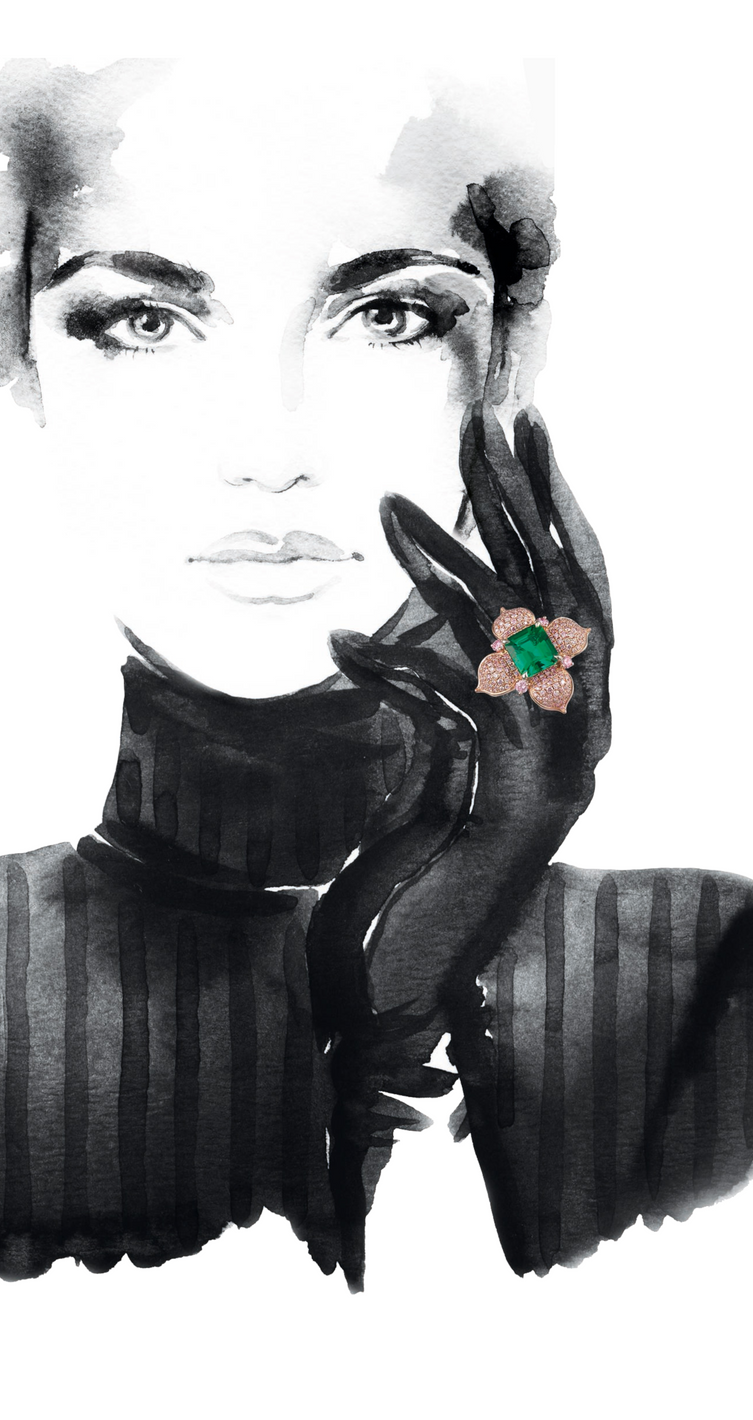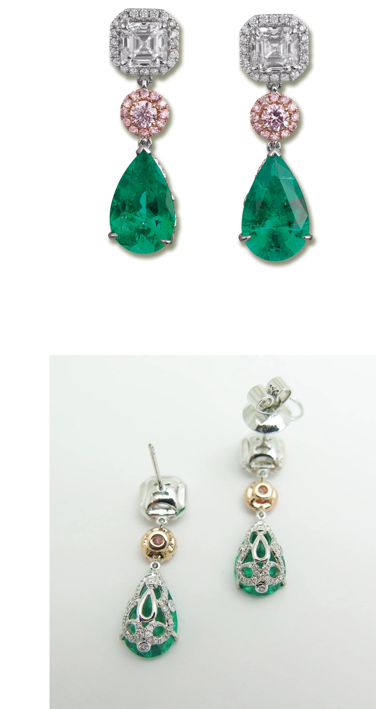A gorgeous pair of pear shaped Muzo emeralds weighing 4.92 carat total, suspended from two D-color, internally flawless emerald cut diamonds, separated by floral motifs of Argyle pink diamonds.