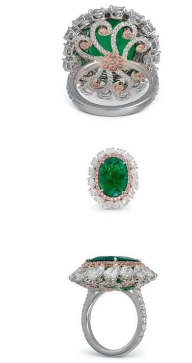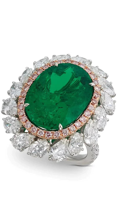 Truly regal ring featuring a beautiful oval emerald weighing 10.30 carat delicately set in platinum and 18K gold wrapped with a layer of Argyle pink diamonds and white diamonds.