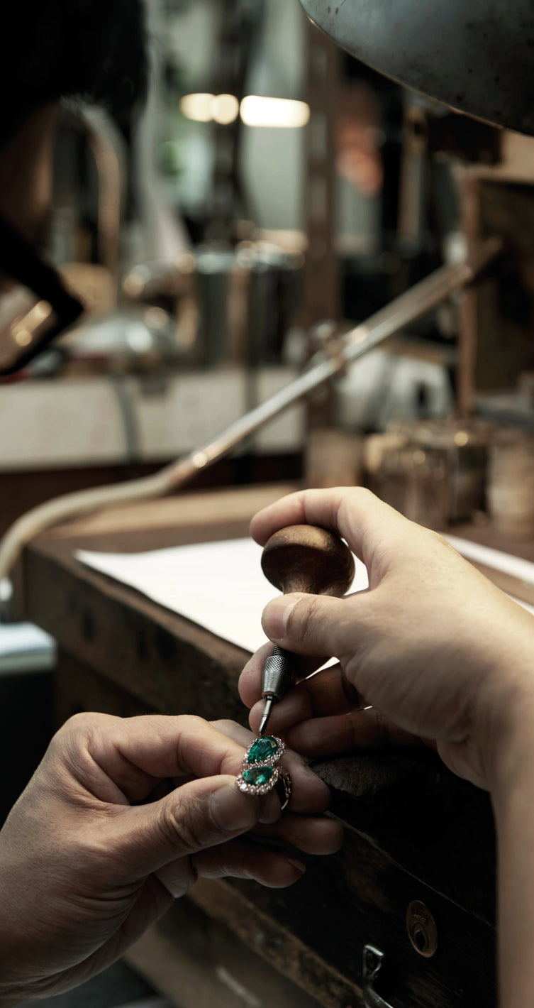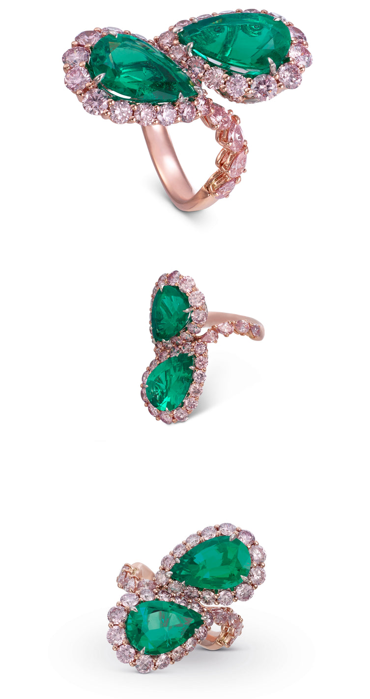 Twin Muzo emeralds surrounded by Argyle pink diamonds set with rose gold in a classic Toi et Moi style. Meaning “you and me” in French, this romantic ring features two beautiful Muzo pear shaped emeralds of 6.08 carat total and nearly one and a half carat of Argyle pink diamonds.