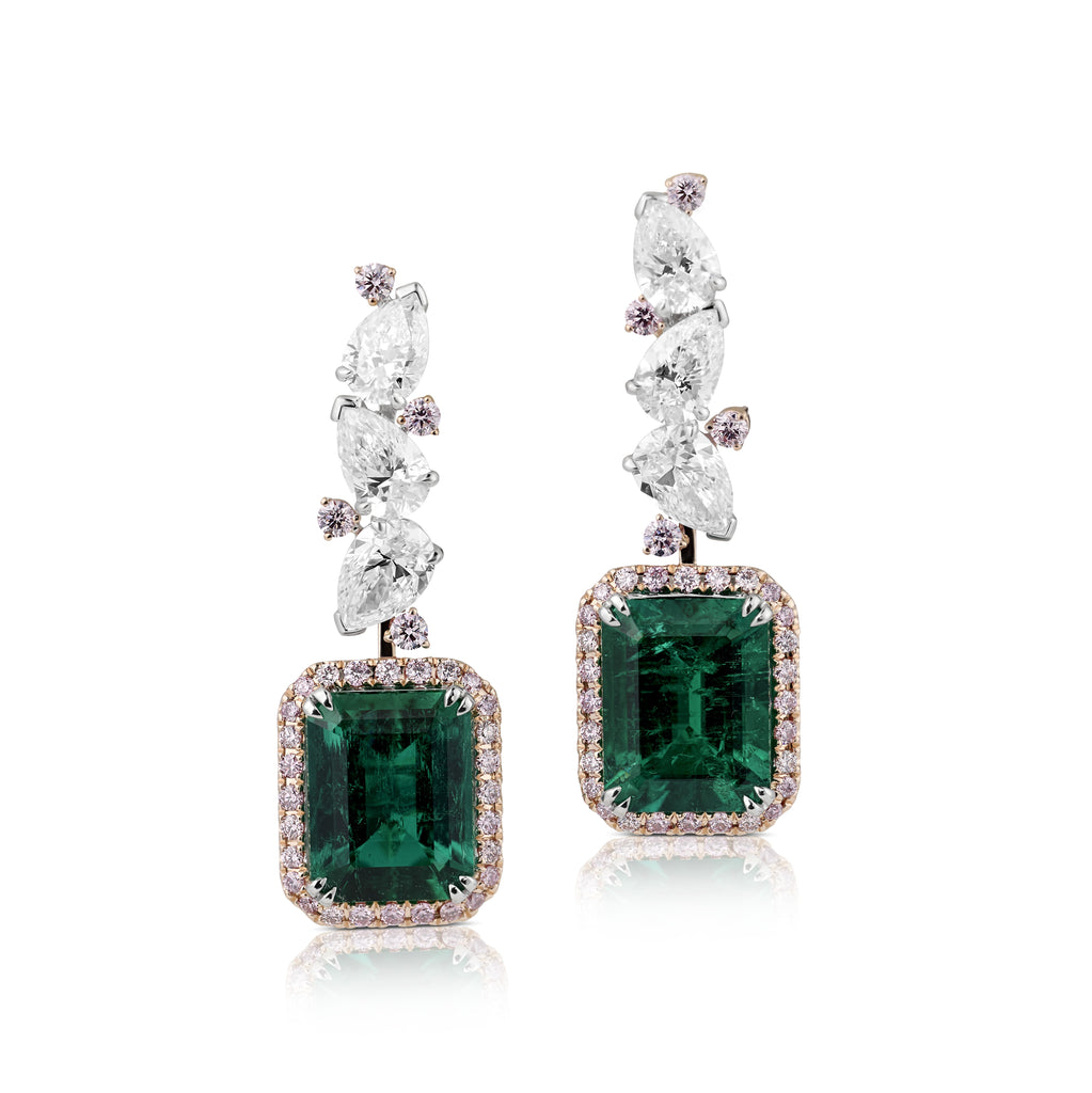 A rare and souft-sounding name. Two Emerald-cut no oil Muzo emeralds, 3.92ct and 3.48ct, each surrounded by a halo of Argyle pink diamonds. Set in a platinum and 18K gold