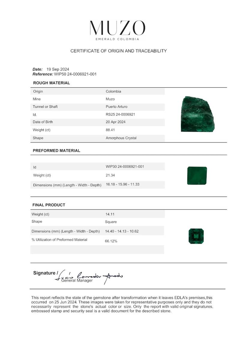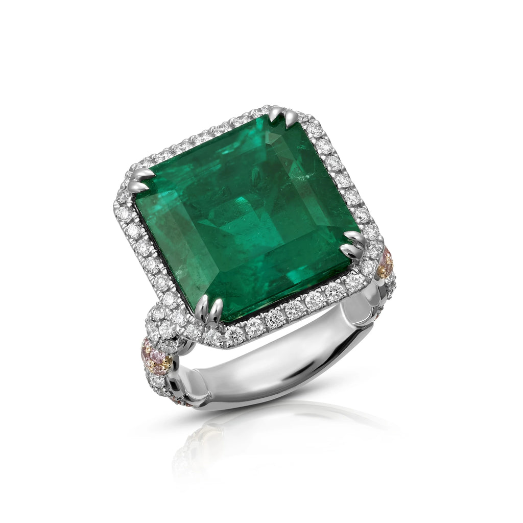 A name with ancient Sanskrit origins -- Bright and powerful. A 14.11ct no oil Muzo emerald set with 1.34cts Argyle pink diamonds and 0.91cts white diamonds set in platinum and 18K gold