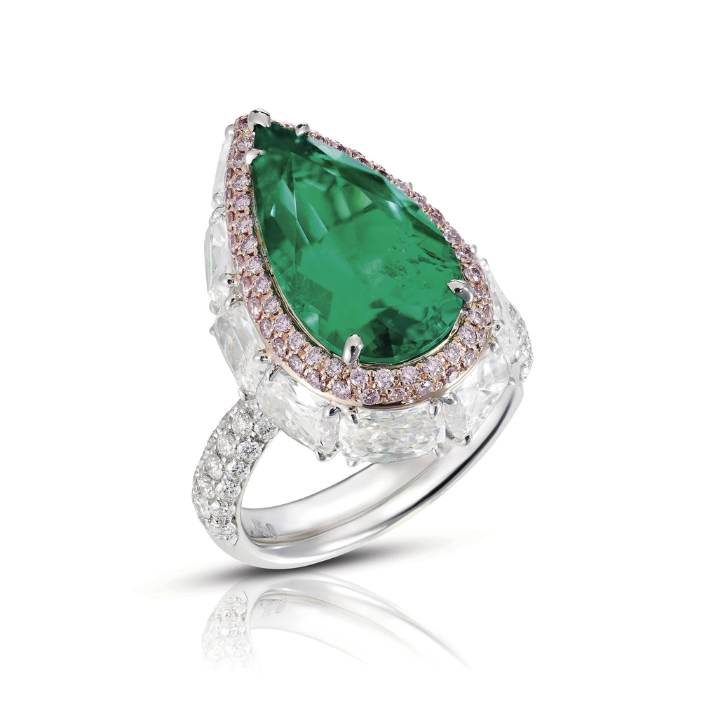 A pear shape no oil Muzo emerald 4.48ct set in a halo of 0.51cts of Argyle pink diamonds.