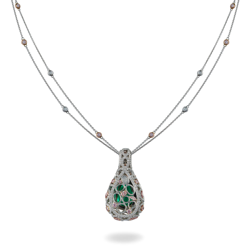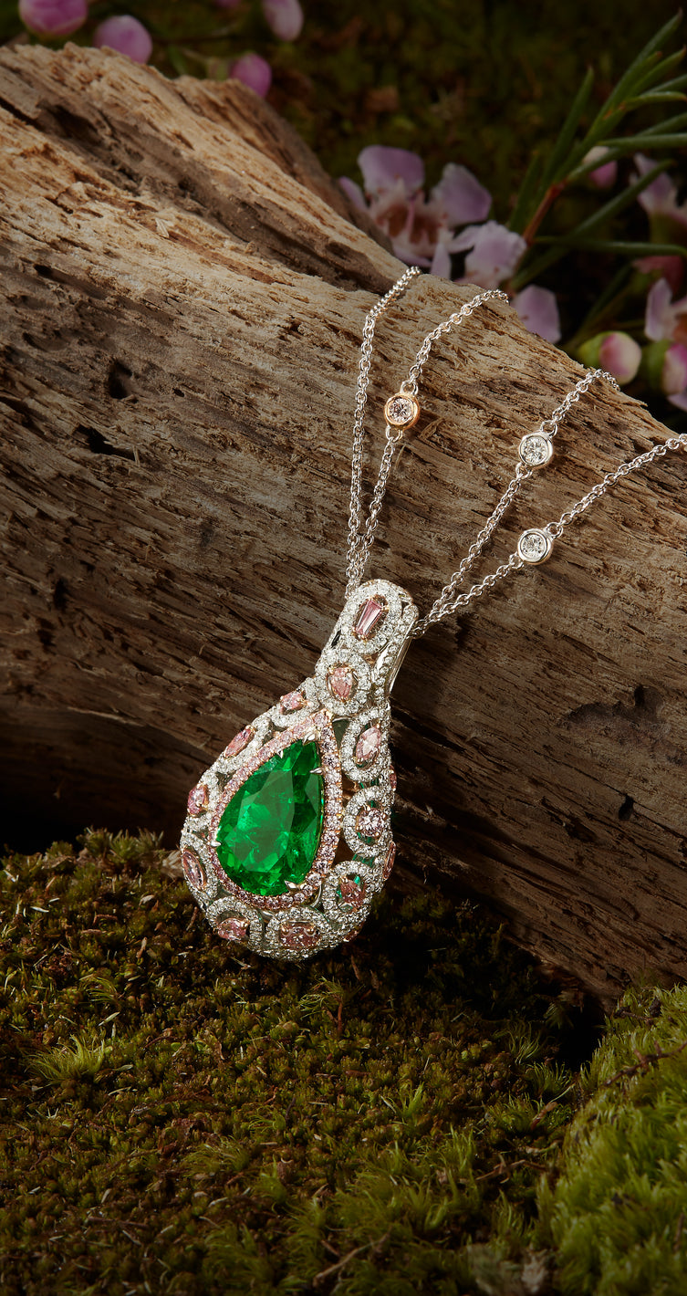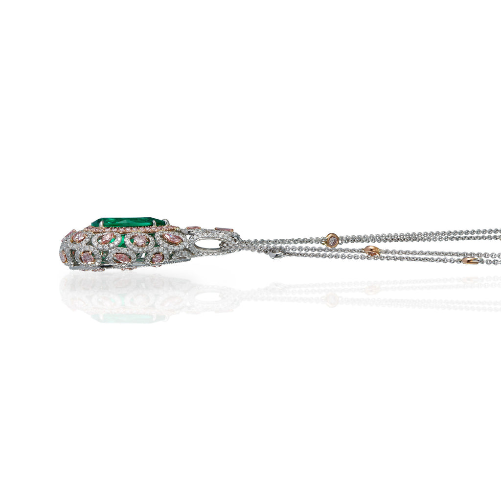 Produced in the finest atelier, ten one-of-a-kind pieces, including rings, pendants and earrings, reveal uncompromising craftsmanship and expert design. Featuring no-oil emeralds and an array of the most striking vivid and fancy pink diamonds, the jewels are finished with fine gold and white diamonds.