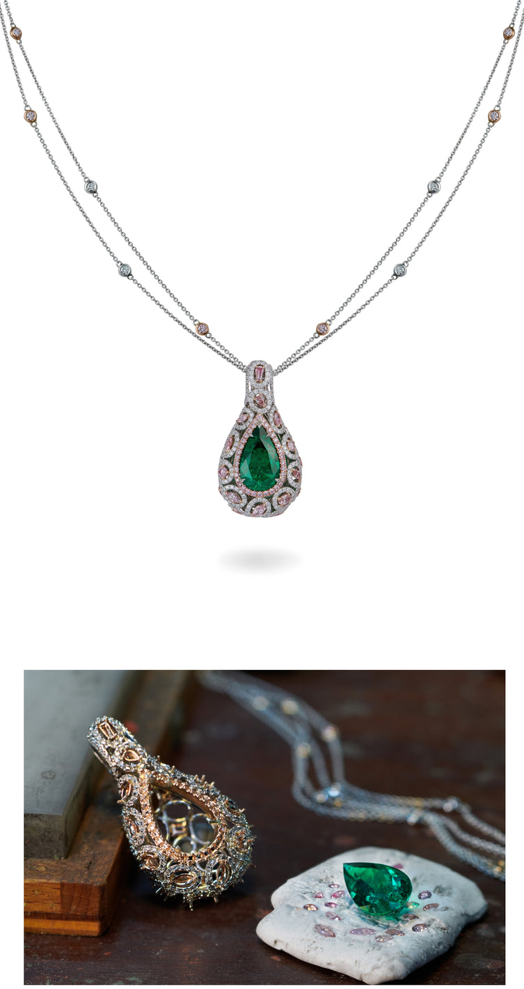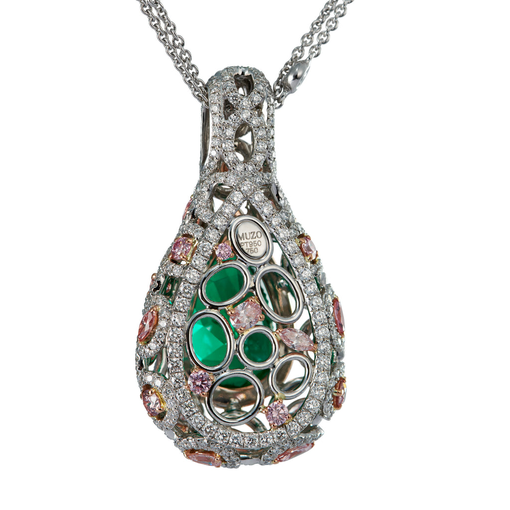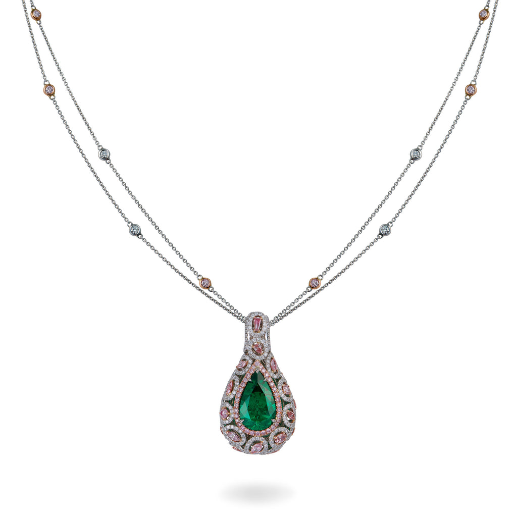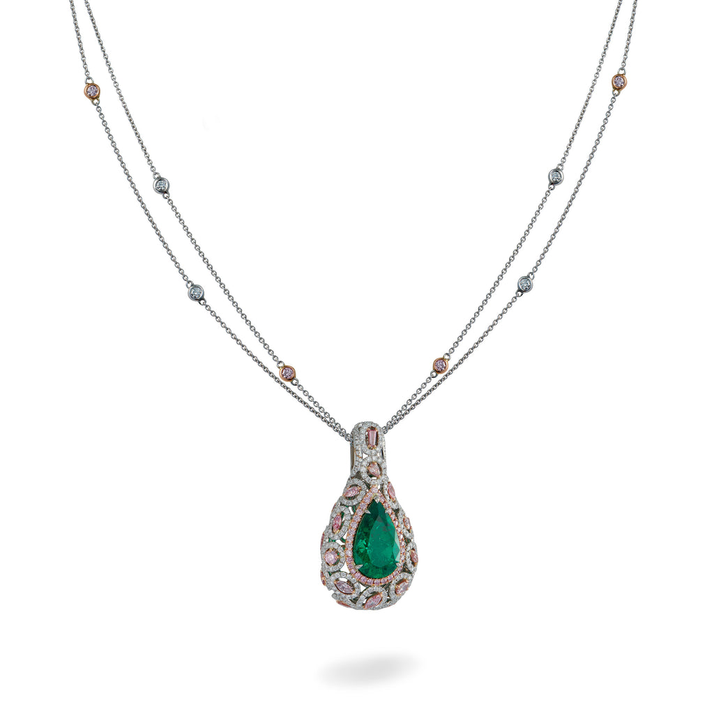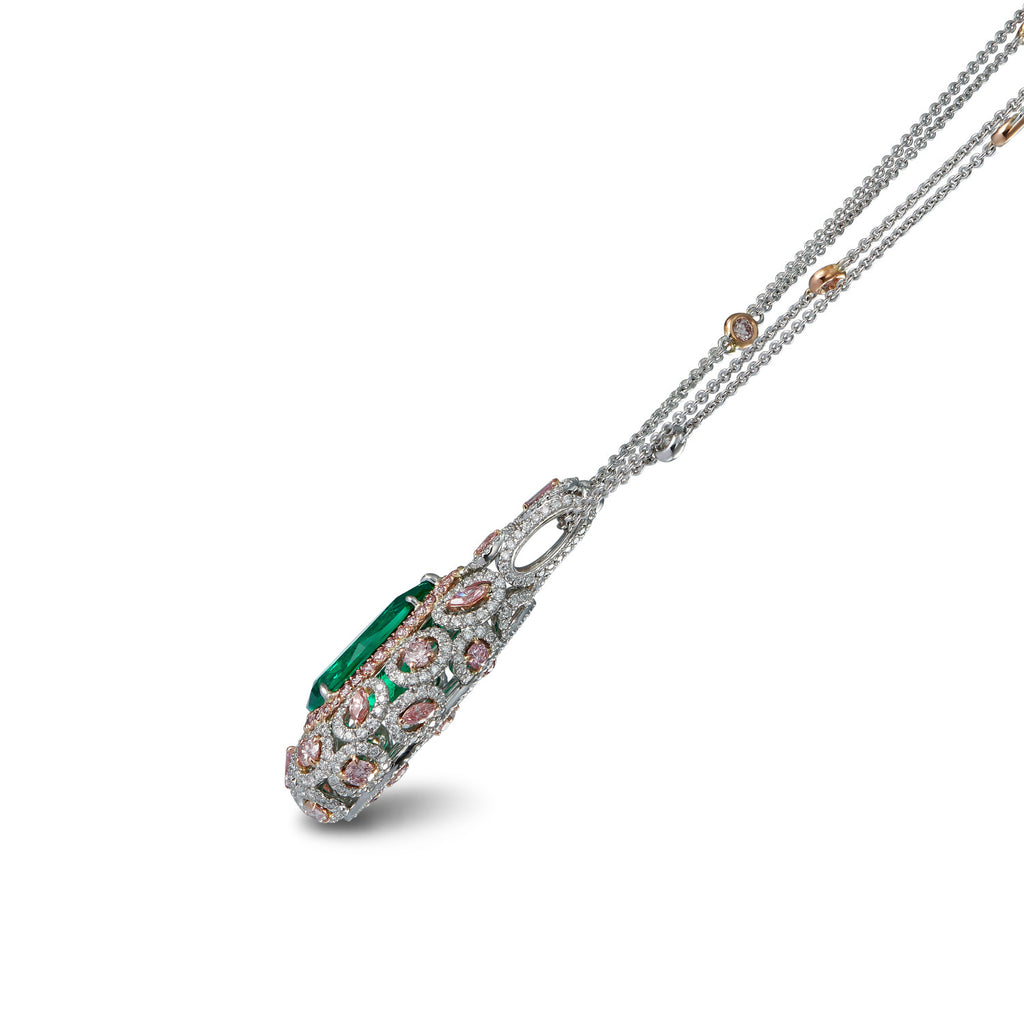 Produced in the finest atelier ten one-of-a-kind pieces including rings pendants and earrings reveal uncompromising craftsmanship expert design. featuring no-oil emeralds an array of most striking vivid fancy pink diamonds jewels are finished with fine gold white diamonds.