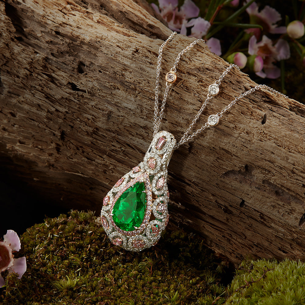 Majestique, the latest in the visionary Green Jewels collaboration, marks the third time two legendary mines have come together to create brilliant, responsibly-sourced earth magic. Mother nature has both inspired and created the enchanting gems that form deep within the earth’s surface: the emeralds, a gift from the ancient Los Andes mountains of Colombia, and the pink diamonds, sourced from the rugged, red wilderness of Australia’s remote East Kimberly region. The Argyle pink diamond mines ceased production late last year, rendering those in this collection rare and even more covetable. The rarity of the Argyle pink diamonds coupled with the brilliance of Muzo's magnificent emeralds provides an unprecedented investment opportunity; a unique occasion to own a masterpiece jewel of contemporary, wearable art.