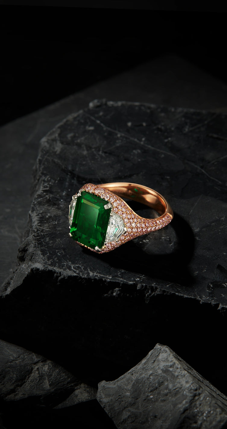 Majestique, the latest in the visionary Green Jewels collaboration, marks the third time two legendary mines have come together to create brilliant, responsibly-sourced earth magic. Mother nature has both inspired and created the enchanting gems that form deep within the earth’s surface: the emeralds, a gift from the ancient Los Andes mountains of Colombia, and the pink diamonds, sourced from the rugged, red wilderness of Australia’s remote East Kimberly region. The Argyle pink diamond mines ceased production late last year, rendering those in this collection rare and even more covetable. The rarity of the Argyle pink diamonds coupled with the brilliance of Muzo's magnificent emeralds provides an unprecedented investment opportunity; a unique occasion to own a masterpiece jewel of contemporary, wearable art.