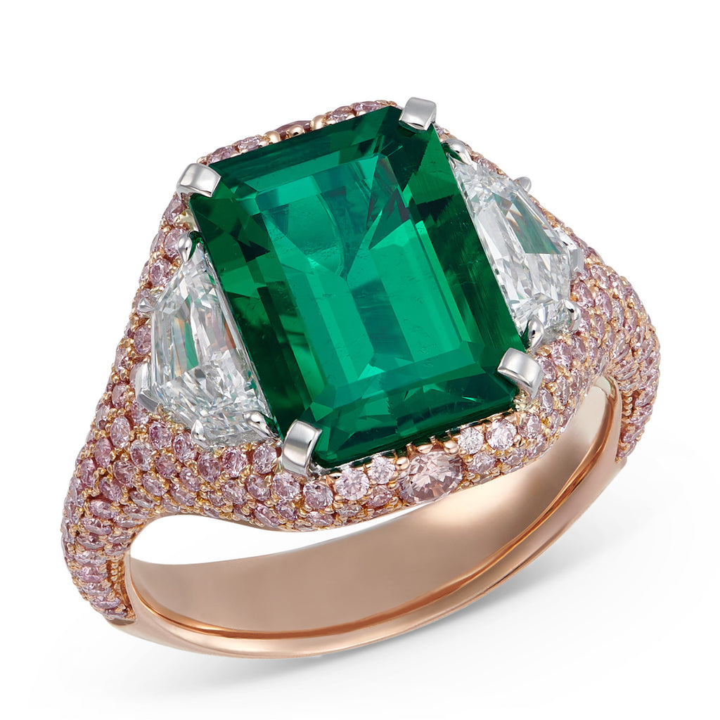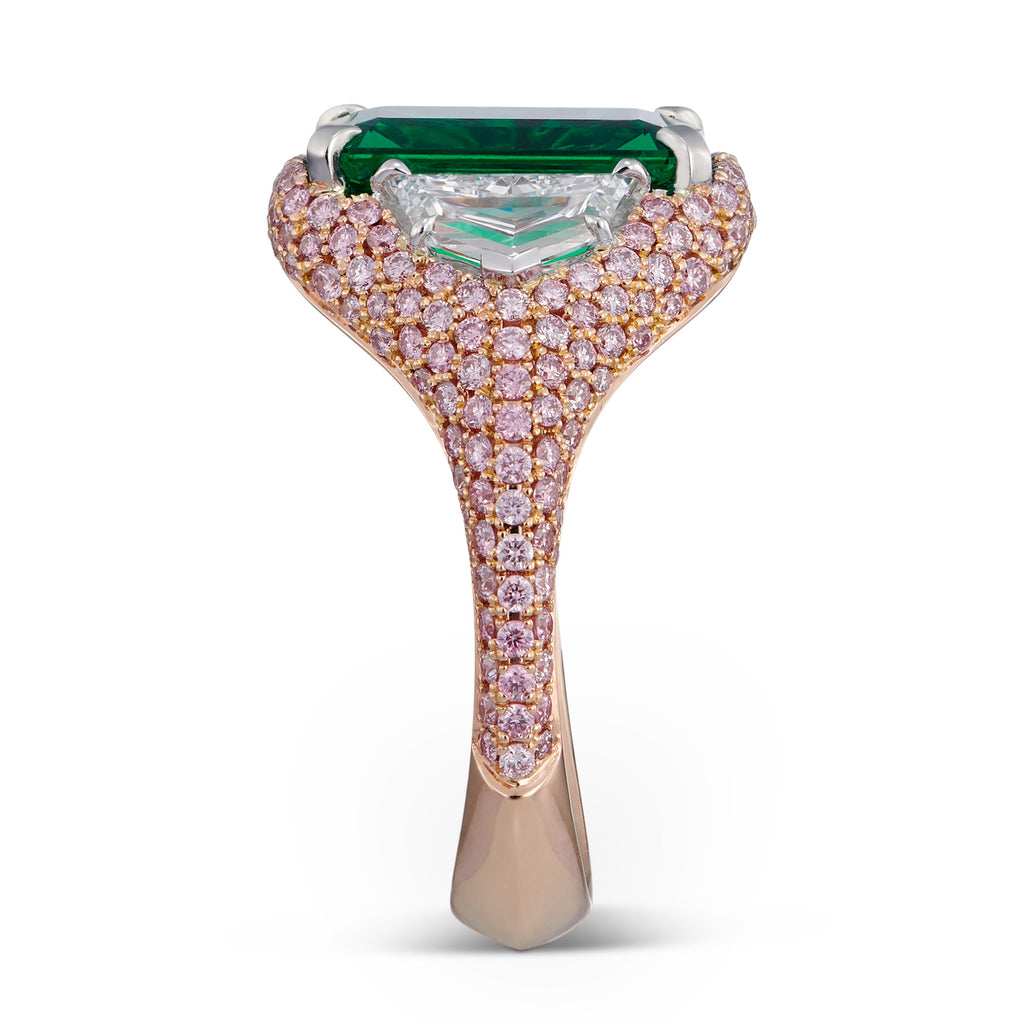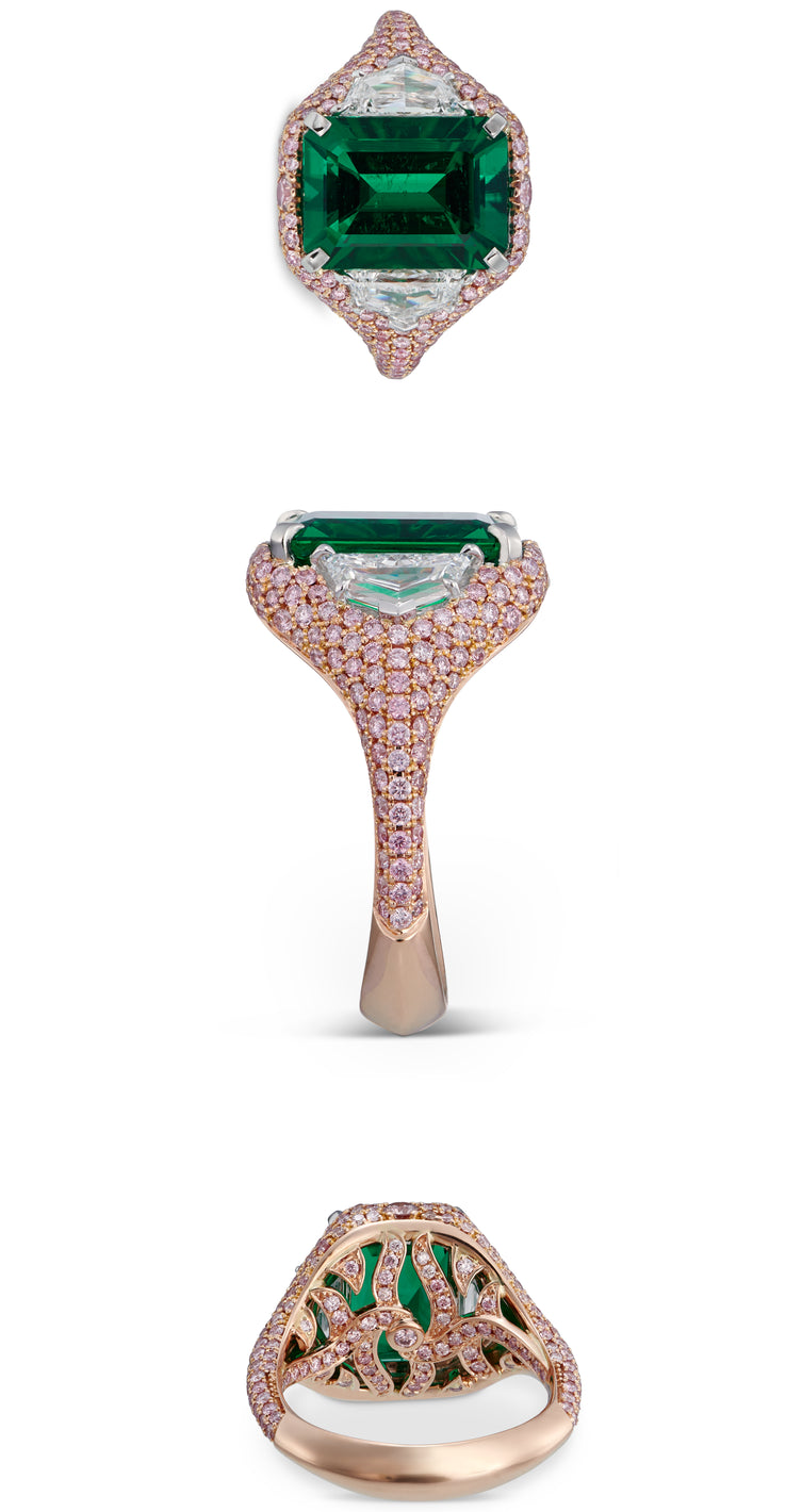 Produced in the finest atelier, ten one-of-a-kind pieces, including rings, pendants and earrings, reveal uncompromising craftsmanship and expert design. Featuring no-oil emeralds and an array of the most striking vivid and fancy pink diamonds, the jewels are finished with fine gold and white diamonds.