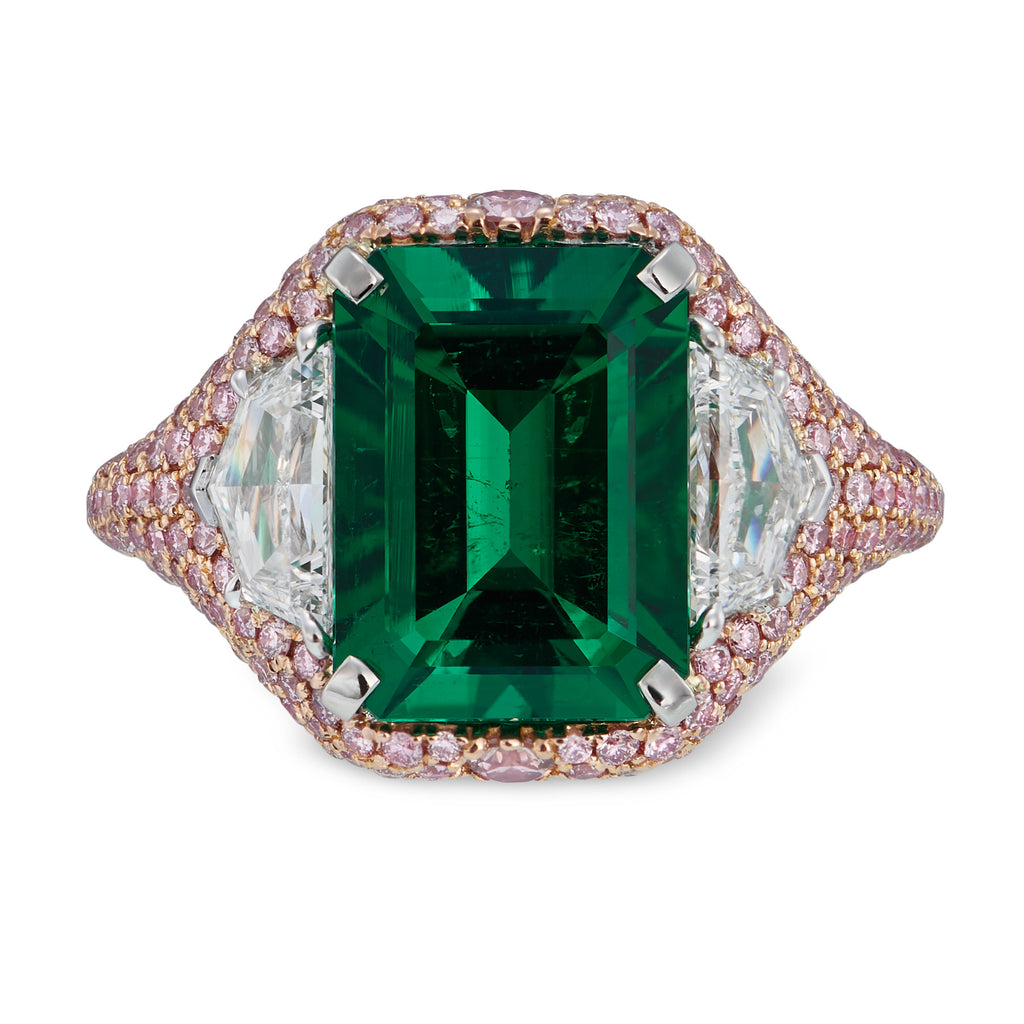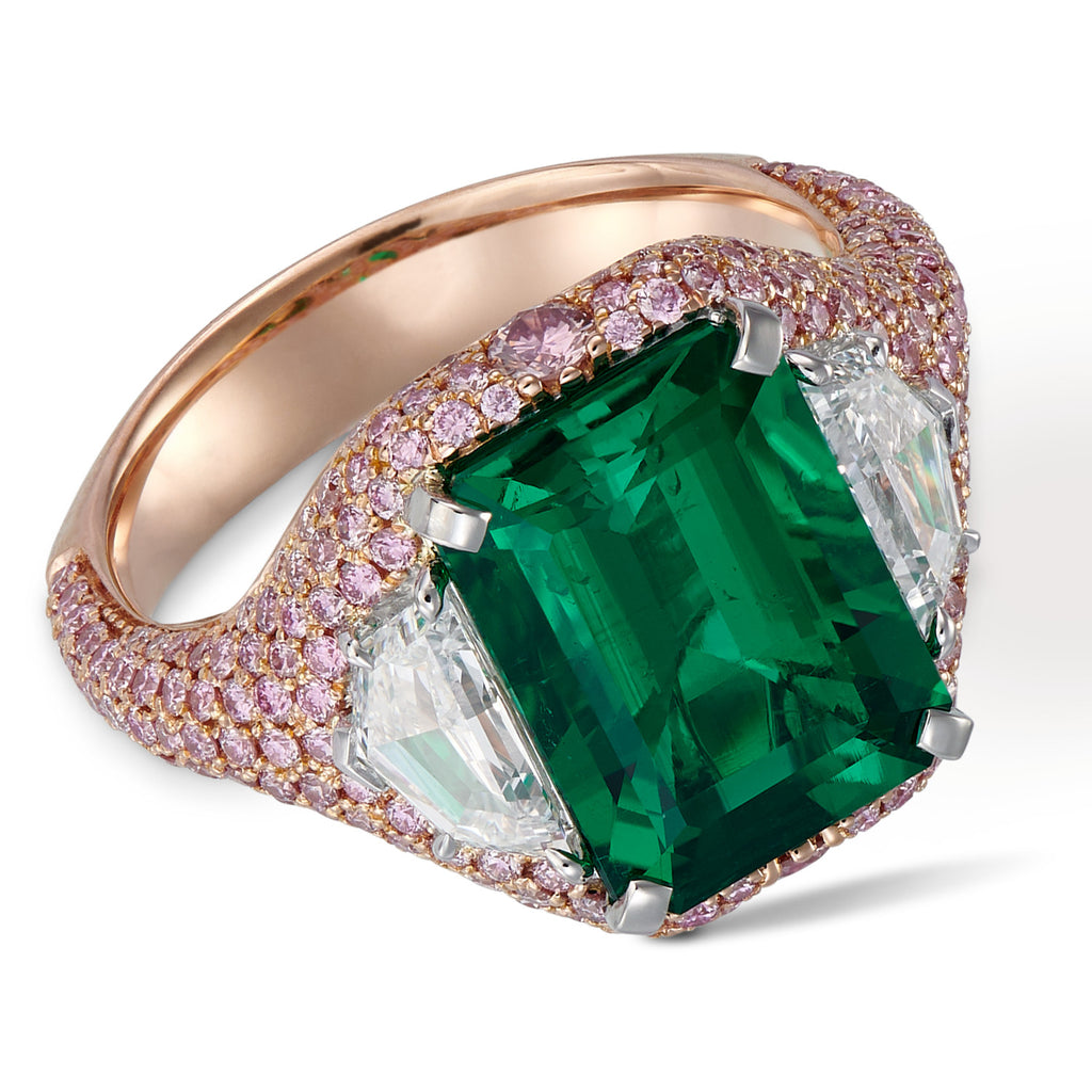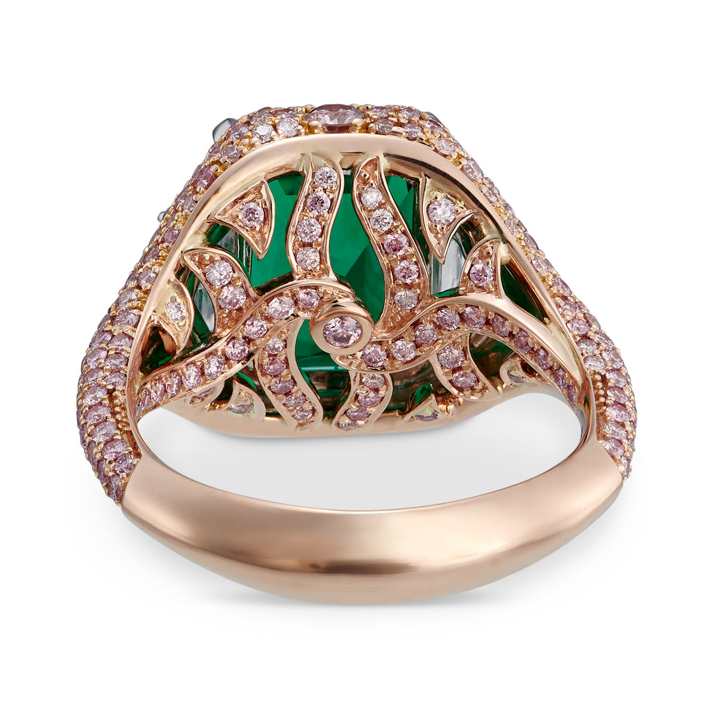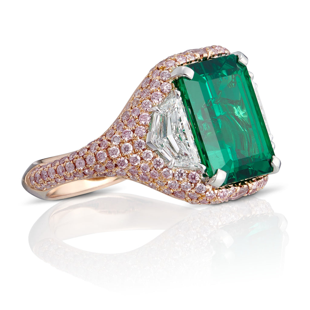 Produced in the finest atelier, ten one-of-a-kind pieces, including rings, pendants and earrings, reveal uncompromising craftsmanship and expert design. Featuring no-oil emeralds and an array of the most striking vivid and fancy pink diamonds, the jewels are finished with fine gold and white diamonds.