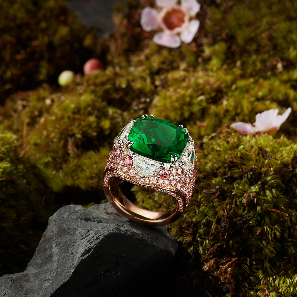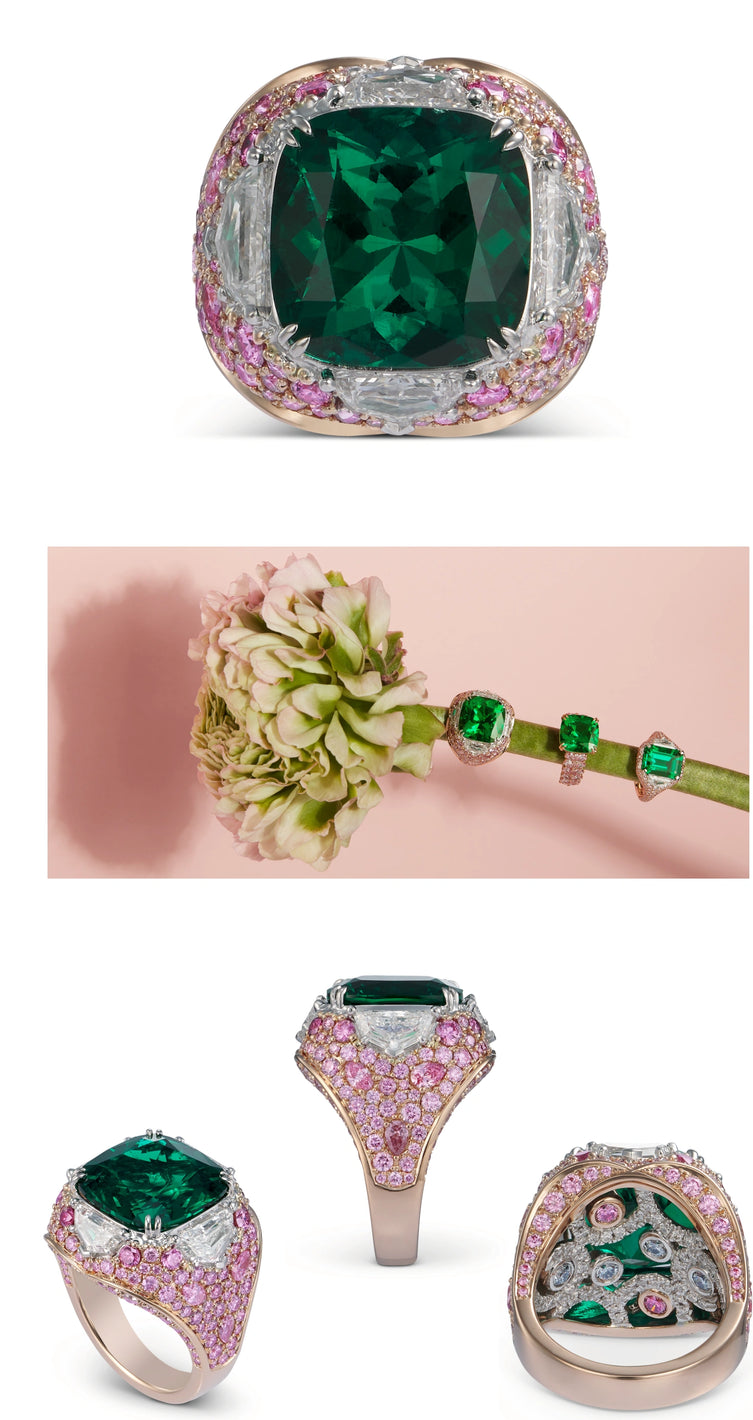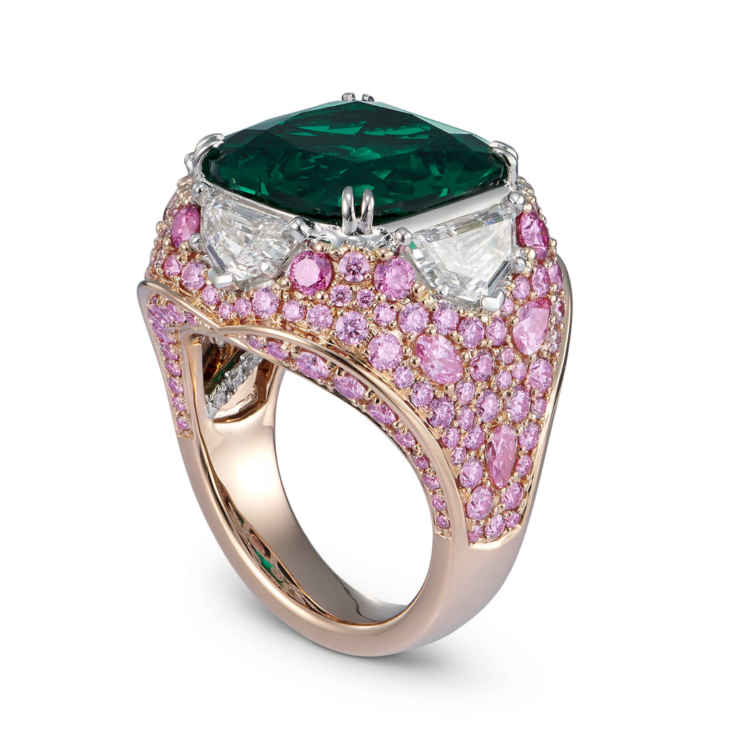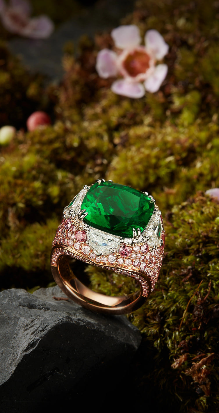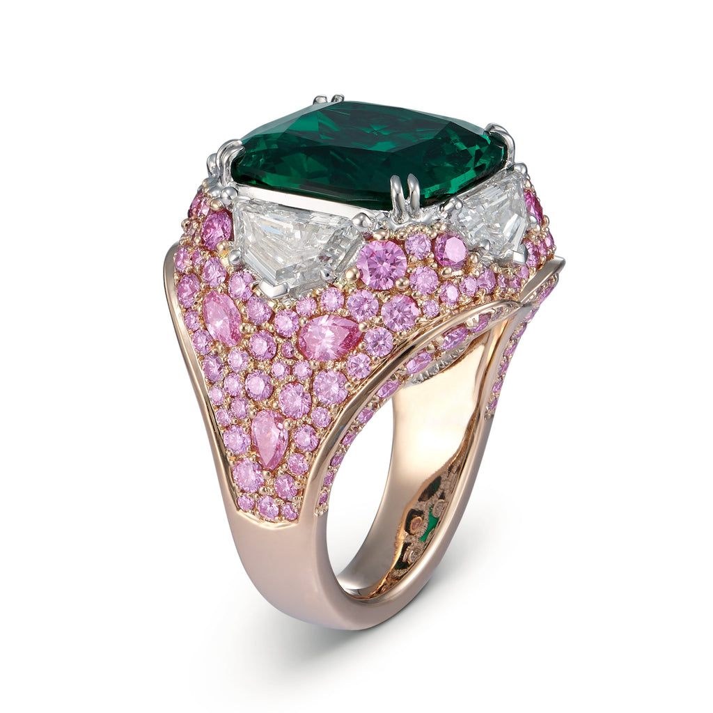 Produced in the finest atelier, ten one-of-a-kind pieces, including rings, pendants and earrings, reveal uncompromising craftsmanship and expert design. Featuring no-oil emeralds and an array of the most striking vivid and fancy pink diamonds, the jewels are finished with fine gold and white diamonds.