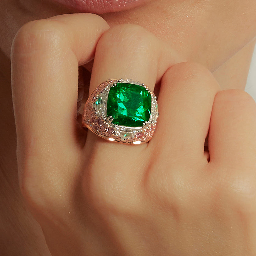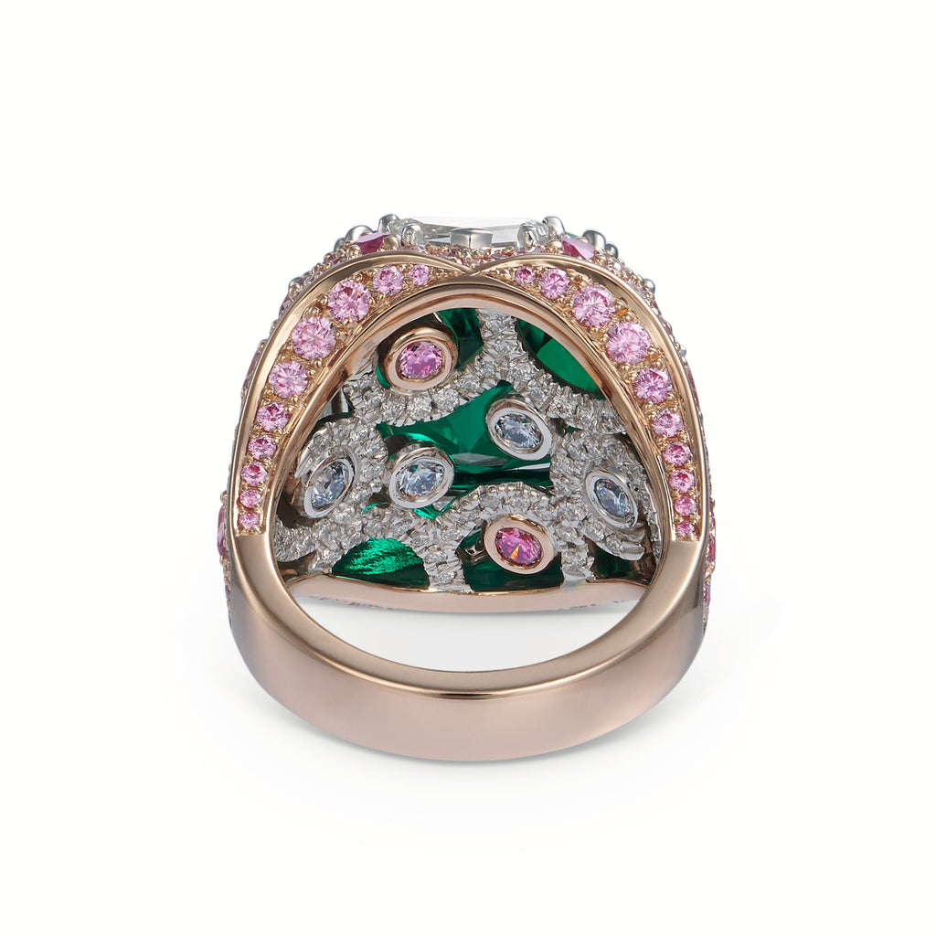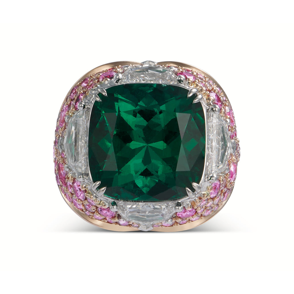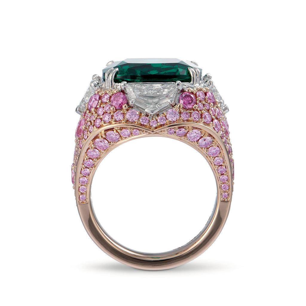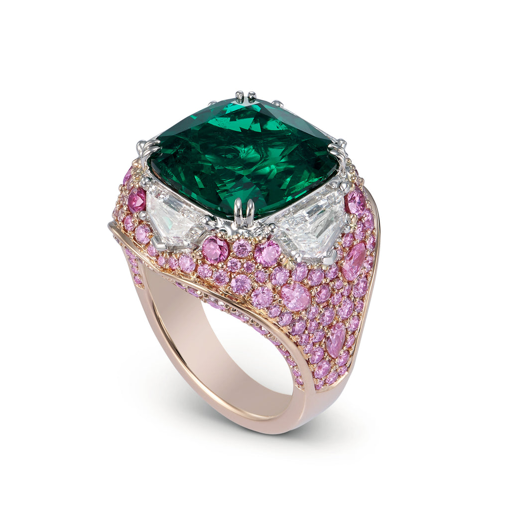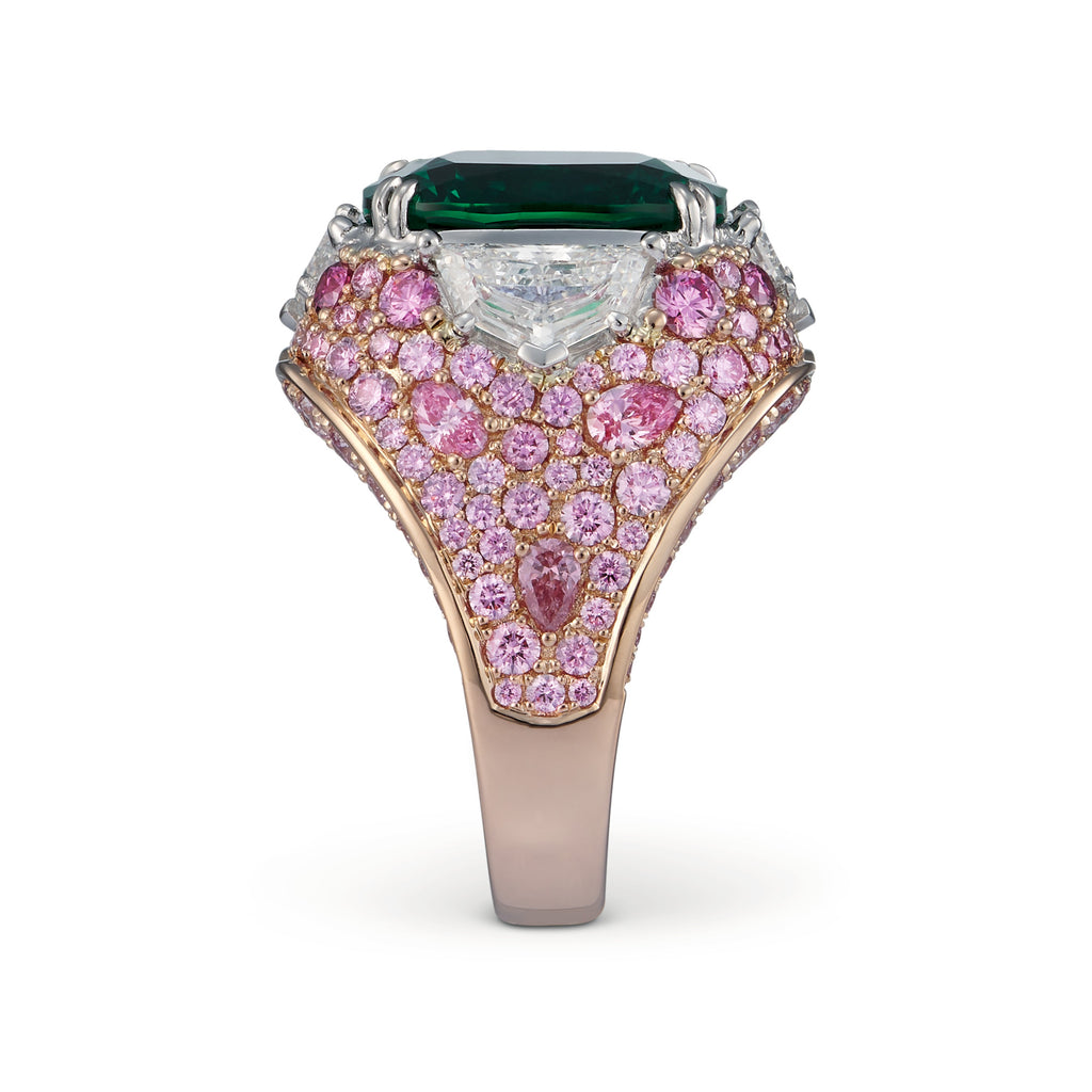 Produced in the finest atelier, ten one-of-a-kind pieces, including rings, pendants and earrings, reveal uncompromising craftsmanship and expert design. Featuring no-oil emeralds and an array of the most striking vivid and fancy pink diamonds, the jewels are finished with fine gold and white diamonds.