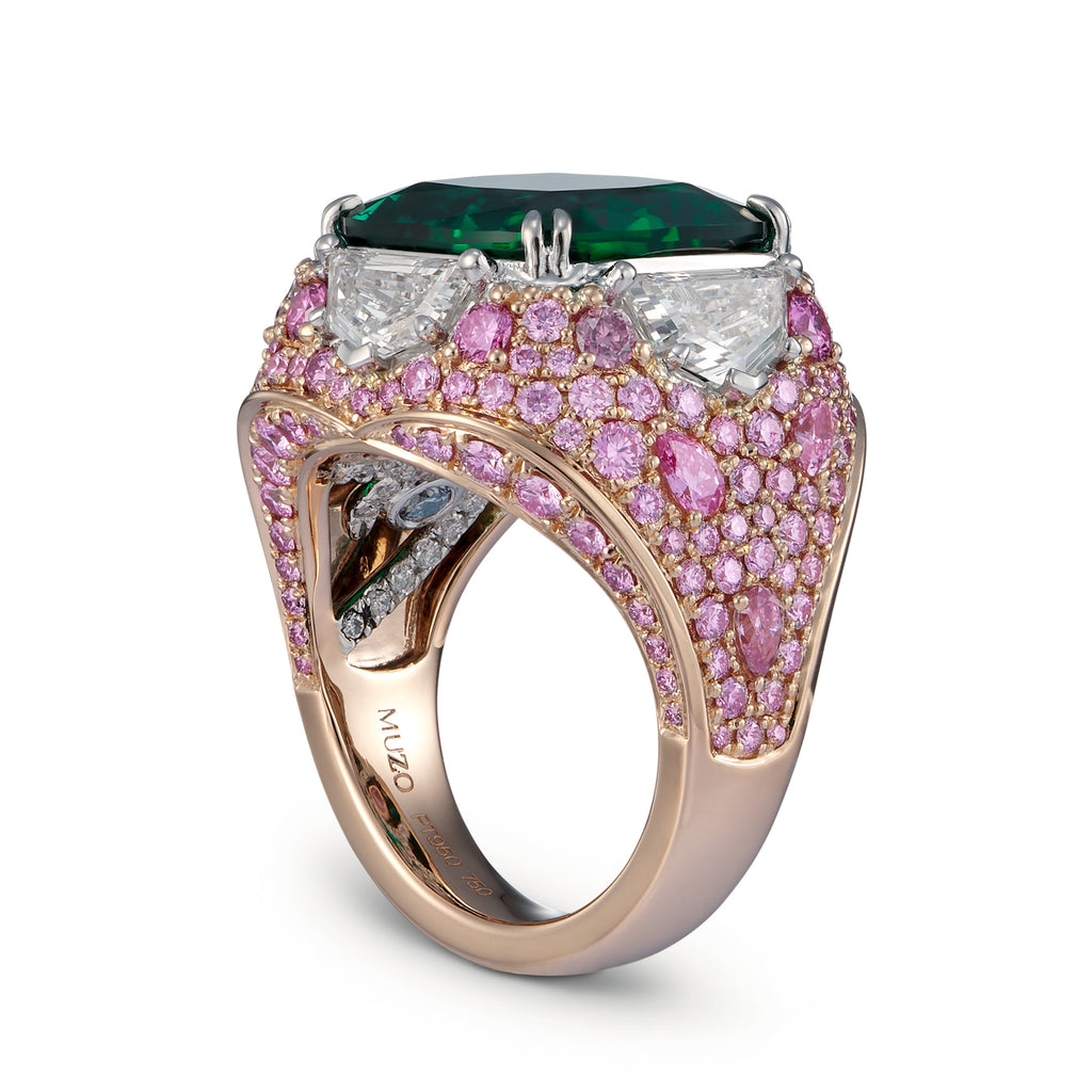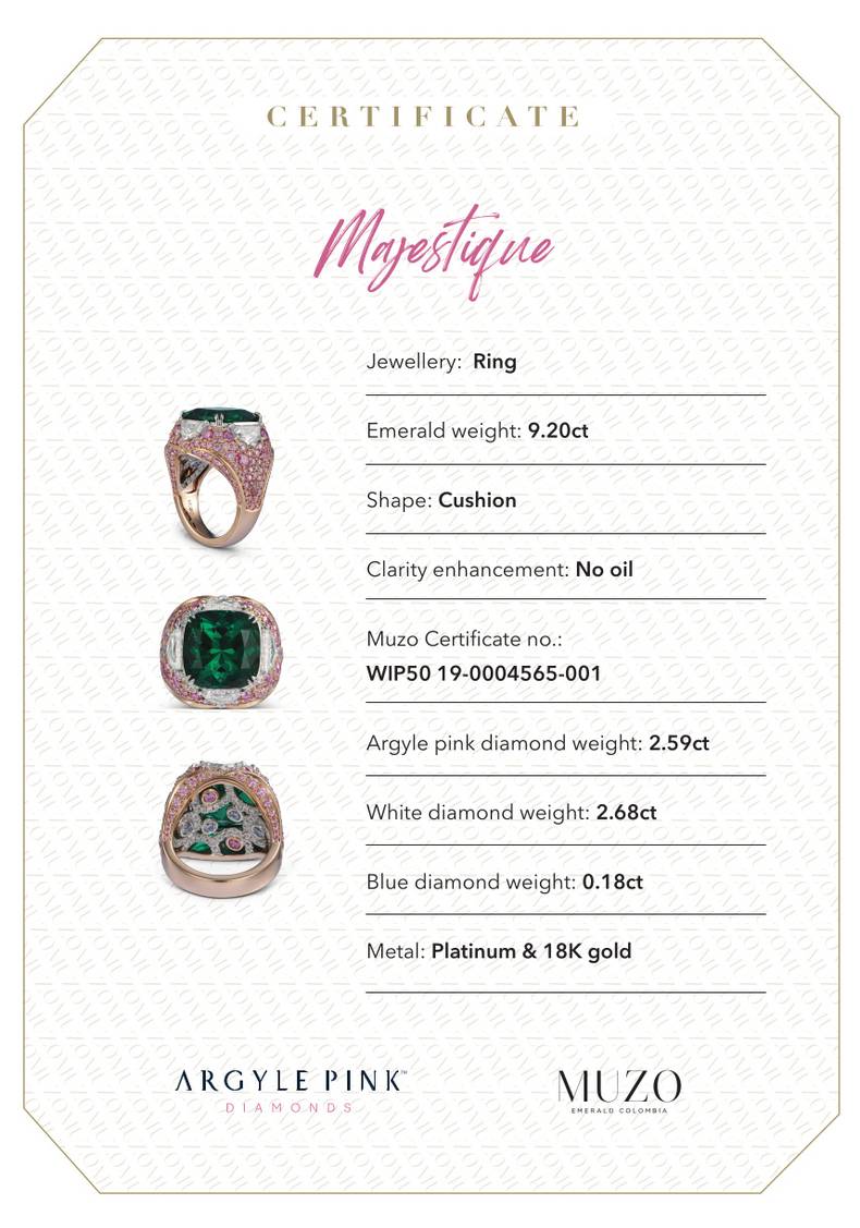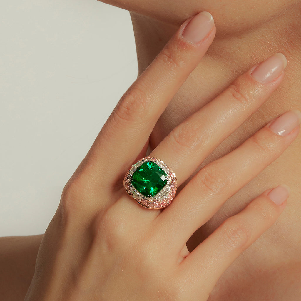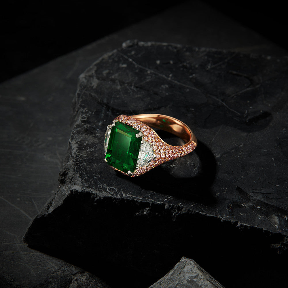 Majestique, the latest in the visionary Green Jewels collaboration, marks the third time two legendary mines have come together to create brilliant, responsibly-sourced earth magic. Mother nature has both inspired and created the enchanting gems that form deep within the earth’s surface: the emeralds, a gift from the ancient Los Andes mountains of Colombia, and the pink diamonds, sourced from the rugged, red wilderness of Australia’s remote East Kimberly region. The Argyle pink diamond mines ceased production late last year, rendering those in this collection rare and even more covetable. The rarity of the Argyle pink diamonds coupled with the brilliance of Muzo's magnificent emeralds provides an unprecedented investment opportunity; a unique occasion to own a masterpiece jewel of contemporary, wearable art.