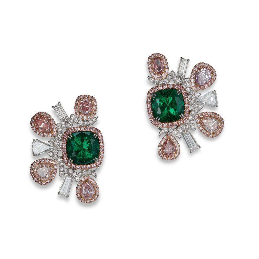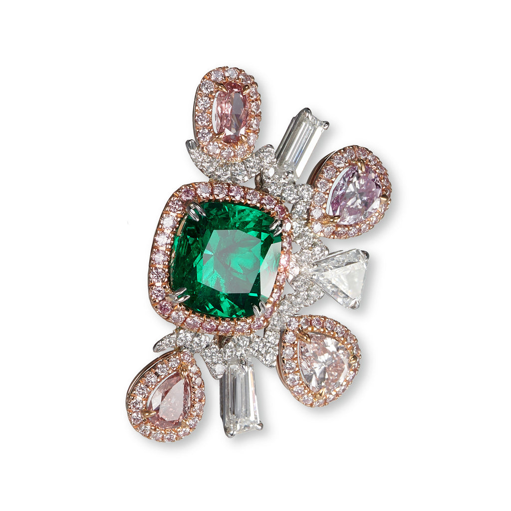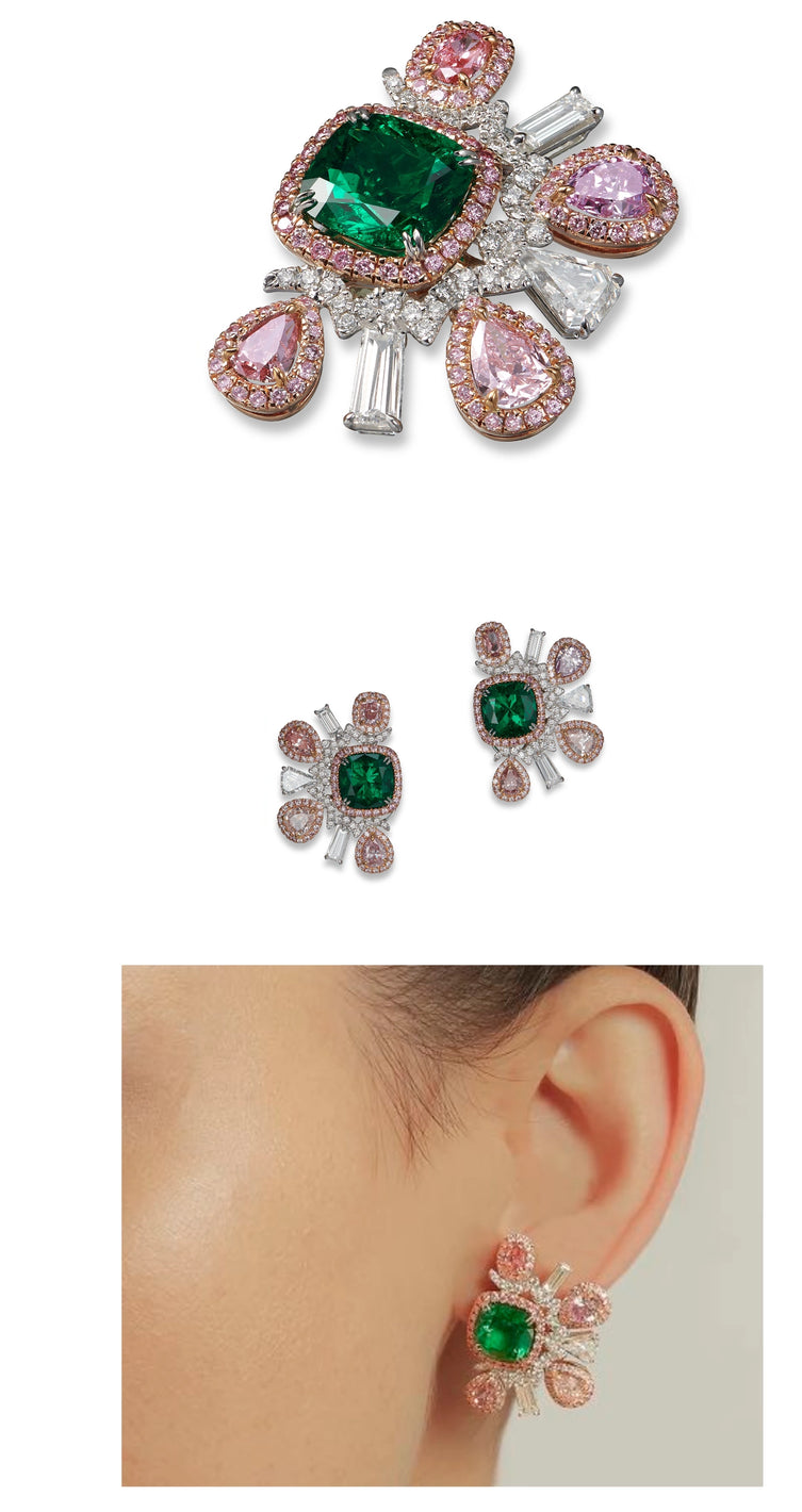 Produced in the finest atelier, ten one-of-a-kind pieces, including rings, pendants and earrings, reveal uncompromising craftsmanship and expert design. Featuring no-oil emeralds and an array of the most striking vivid and fancy pink diamonds, the jewels are finished with fine gold and white diamonds.