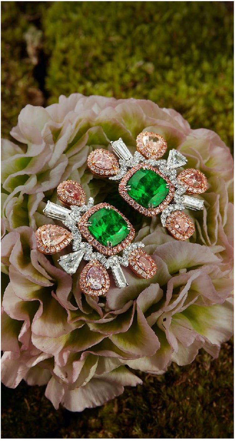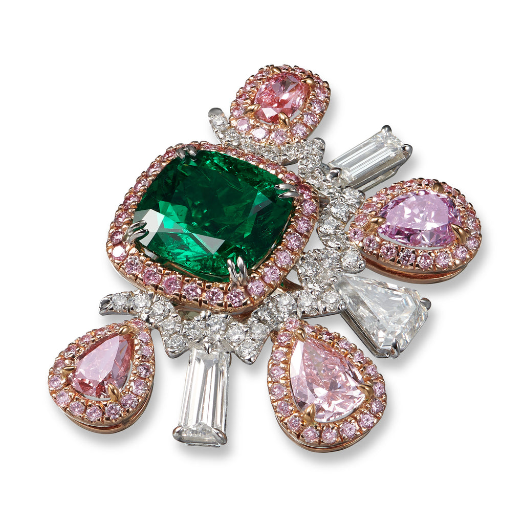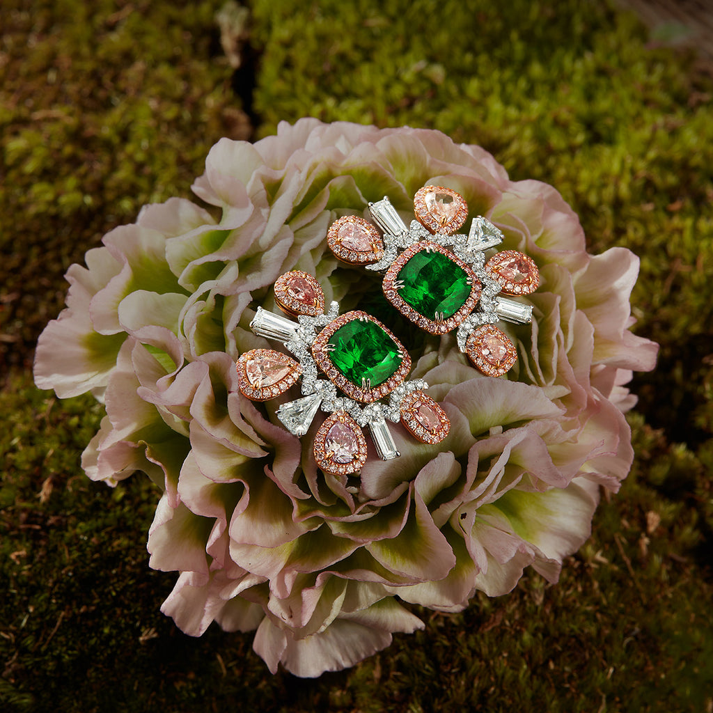 Produced in the finest atelier, ten one-of-a-kind pieces, including rings, pendants and earrings, reveal uncompromising craftsmanship and expert design. Featuring no-oil emeralds and an array of the most striking vivid and fancy pink diamonds, the jewels are finished with fine gold and white diamonds.