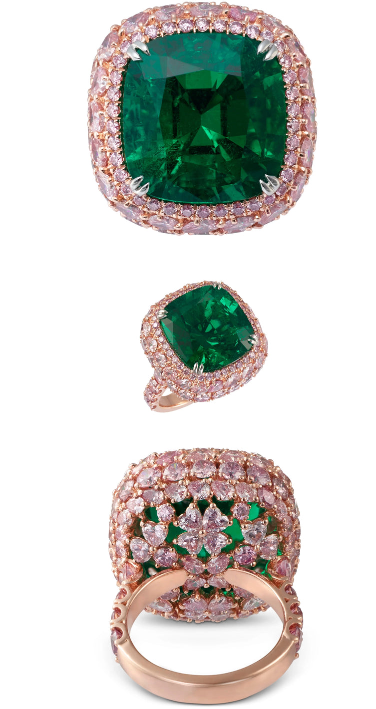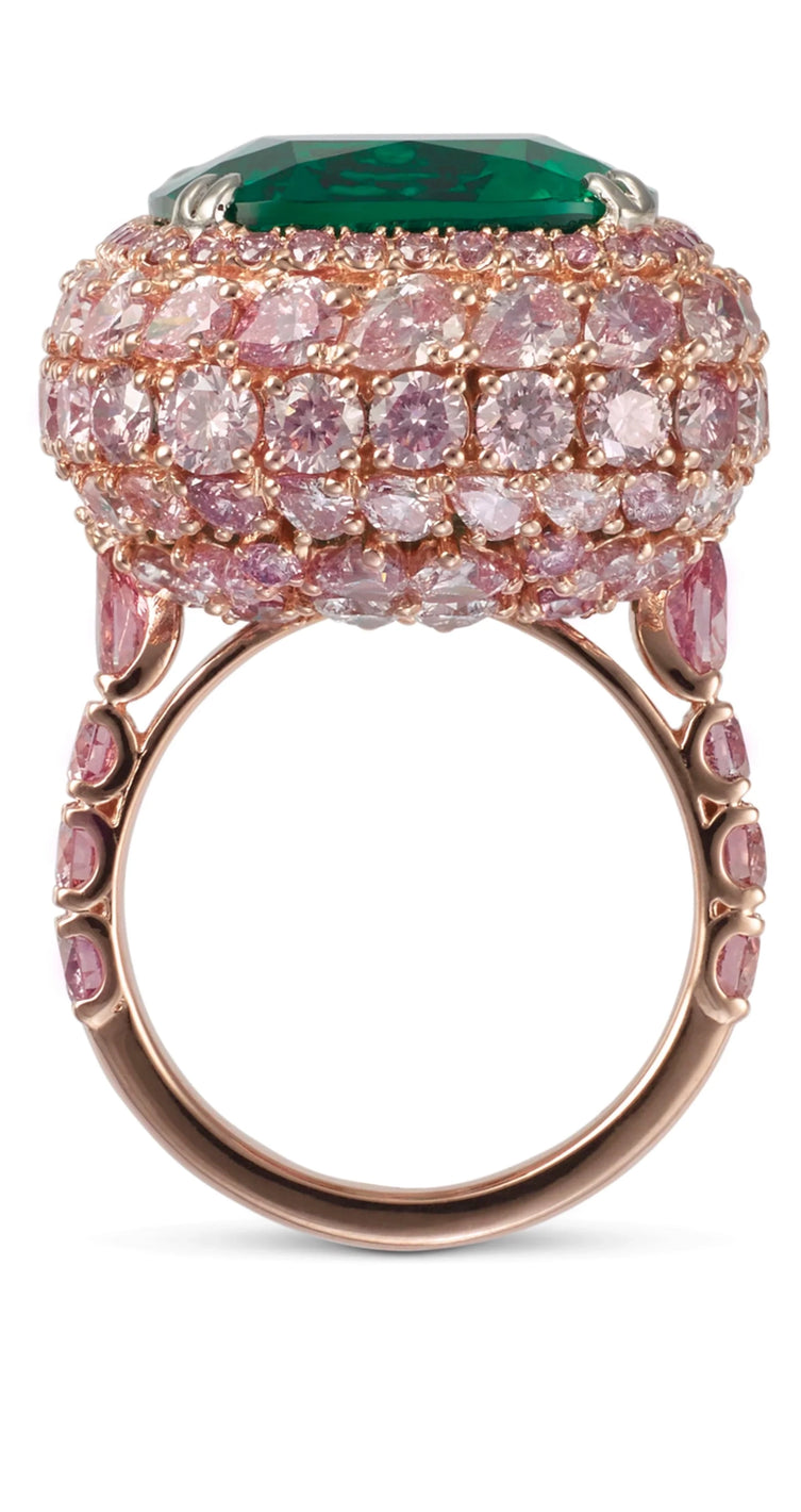 The first Green Jewel Collection of 2017 first brought Muzo and Argyle Pink Diamonds together in a beautiful alliance. Both presented rare, exquisite treasures from Earth’s deepest natural vaults — exceptionally fine emeralds from the ancient mountain mines of Colombia and, from halfway across the world, beyond rare vivid pink diamonds unearthed beneath the rugged, red wilderness of Australia’s remote East Kimberly region. A collection of sixteen high jewelry masterpieces designed to best showcase these exceptionally fine gemstones was born. Stunning greens and pinks — a floral palette so abundant in nature — was presented in intricate jeweled bouquets.Like a mythical flower that blooms once in a hundred years, a 13.20-carat gem-quality Colombian emerald was made into a ring amid a floret of enchanting pink diamonds, mesmerizing all who laid eyes on it. This rare stone was a homogenous deep green of incredible clarity. Christened the Green Jewel, it was the crown jewel in the collection it inspired. The Green Jewel Collection embarked on a round-the-world journey — stops included Hong Kong, Geneva, Sydney, Brisbane, New York, Basel and Las Vegas — with almost all of the pieces snapped up by the cognoscenti within months of debut. While the jewelry pieces have found their place with new owners, it was only the beginning of the next chapter in this special collaboration.