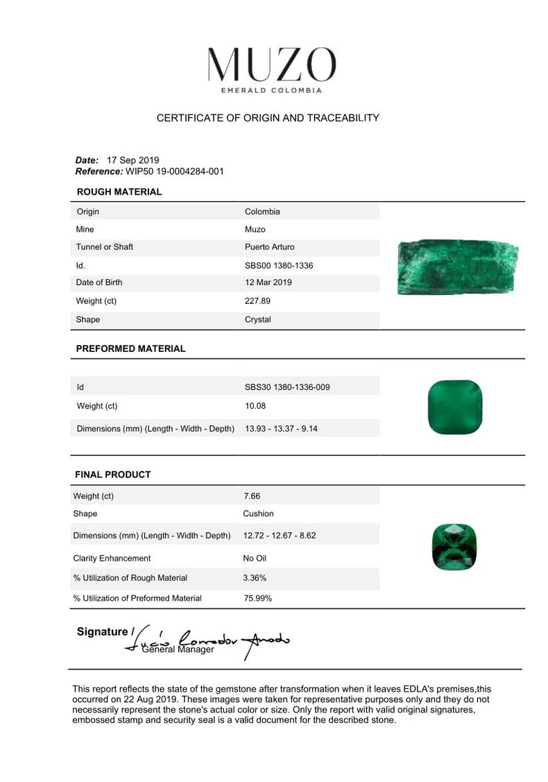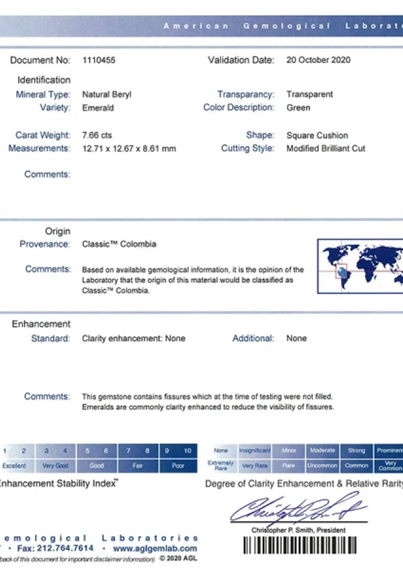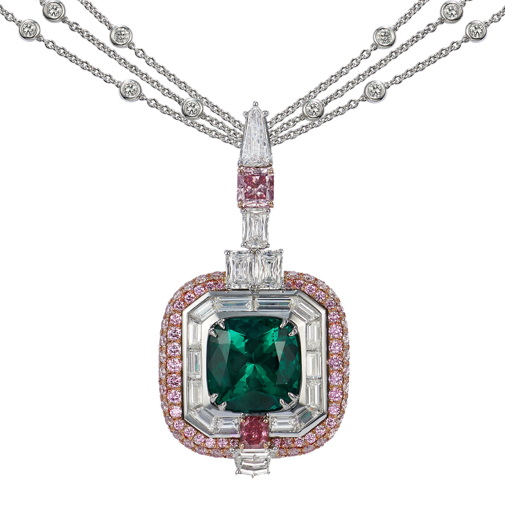 This important jewel, crafted in platinum and 18k rose gold, features a 7.66 carat, no-oil cushion shape, Muzo Emerald set with a 1.06 carat fancy intense purplish pink Argyle diamond, from the final 2021 Signature Argyle Pink Diamonds Tender.